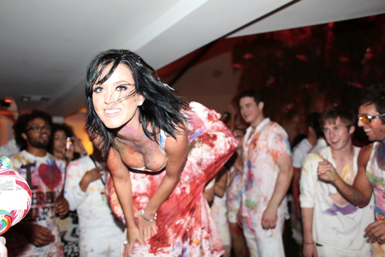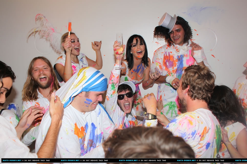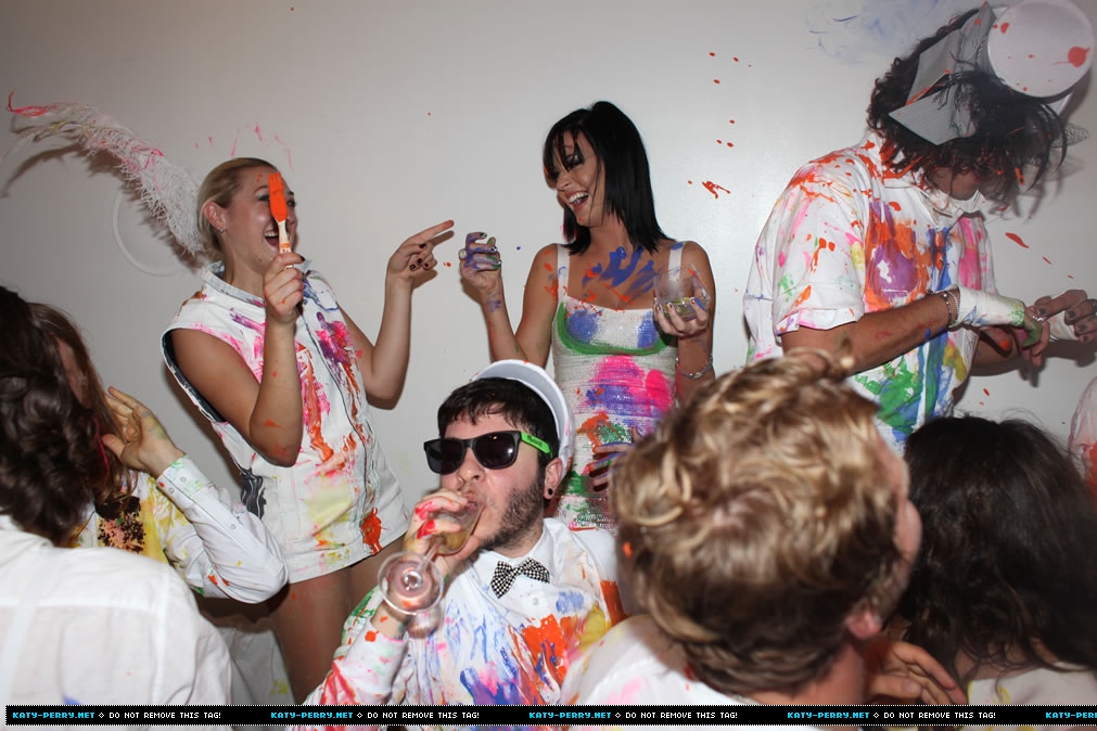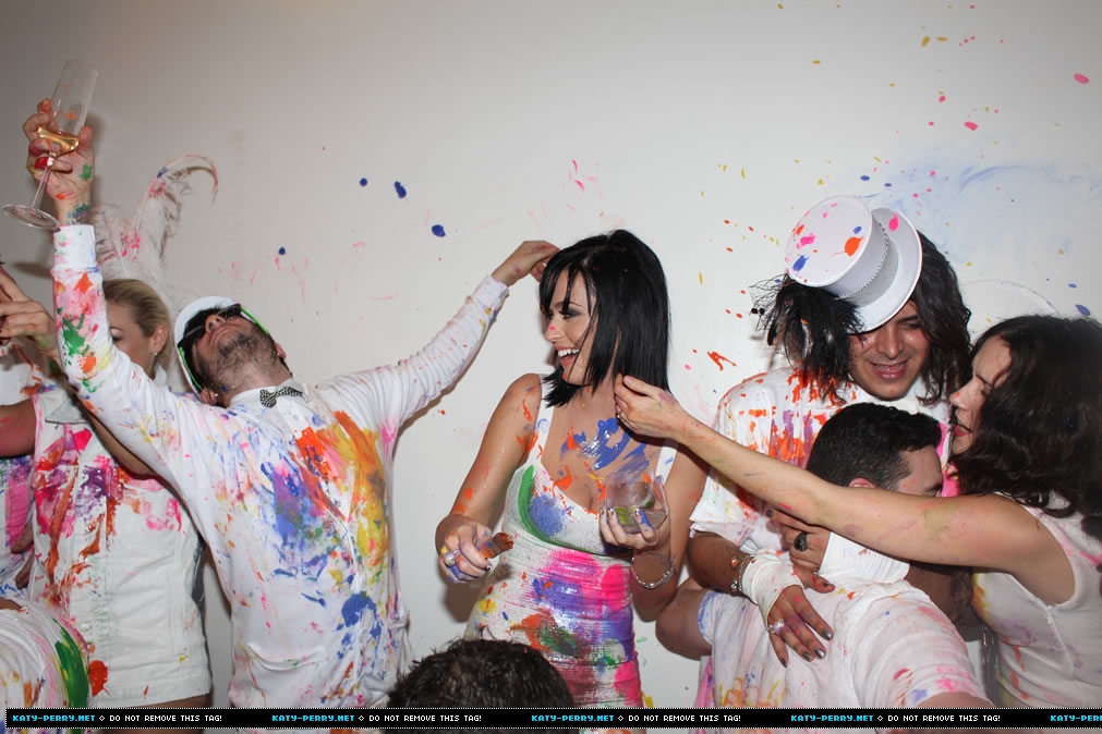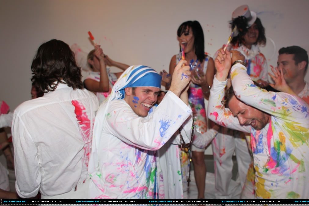 Les invitées étaient donc priés de se présenter en blanc afin de participer à une bataille de peinture. A voir la robe de Katy à la fin, la demoiselle a été une cible privilégiée ! Y en a même qui on malencontreusement visé son décolleté ;)