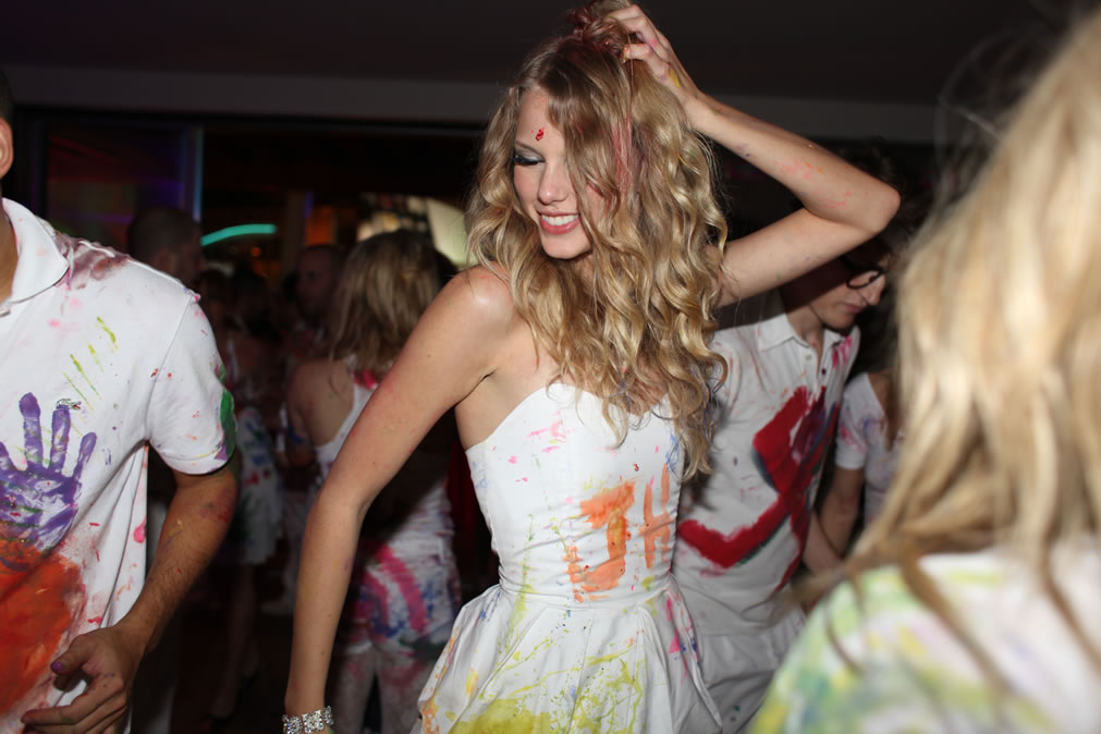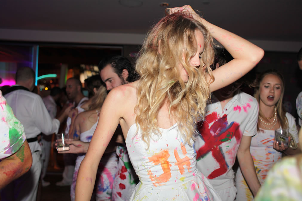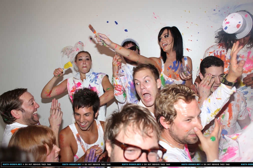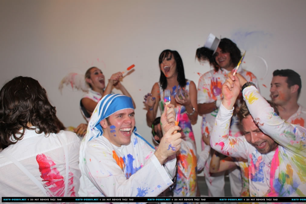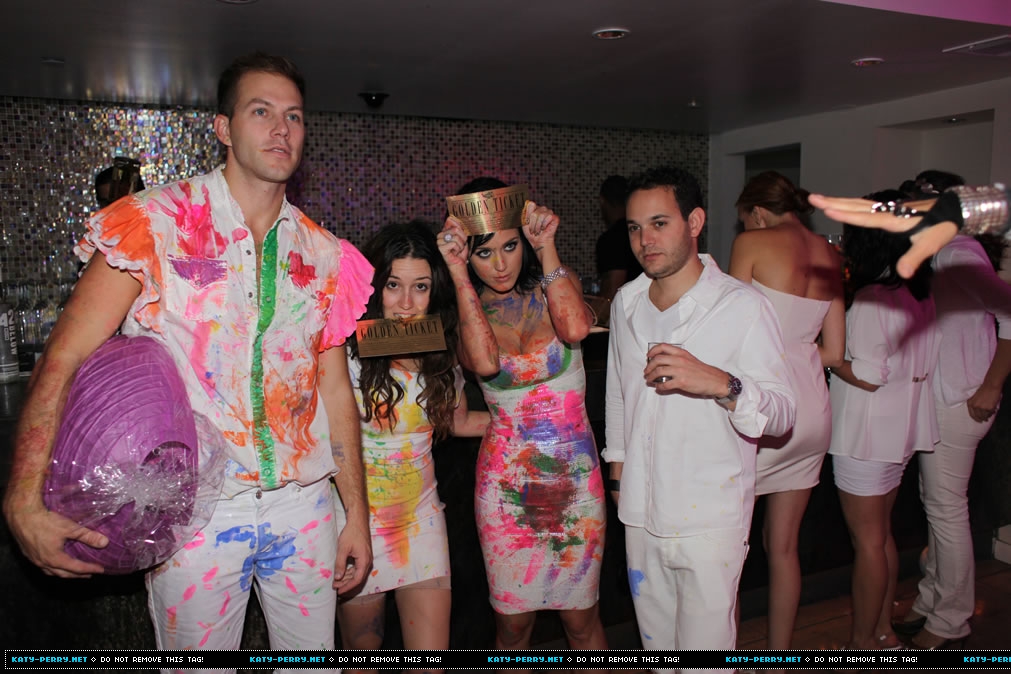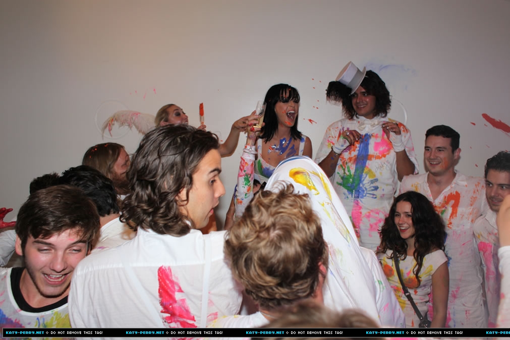Les invitées étaient donc priés de se présenter en blanc afin de participer à une bataille de peinture. A voir la robe de Katy à la fin, la demoiselle a été une cible privilégiée ! Y en a même qui on malencontreusement visé son décolleté ;)