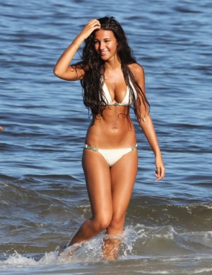 Elle est sur ces photos, présente pour un shooting en bikini blanc et ses formes font ressortir la beauté de ce maillot de bain. Ces longs cheveux bruns sont très souples et son beau sourire montre à quel point elle s’occupe de ses dents. Mais la cerise sur le gâteau est la belle grosse paire de nichons qu’elle a sur la poitrine.