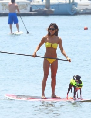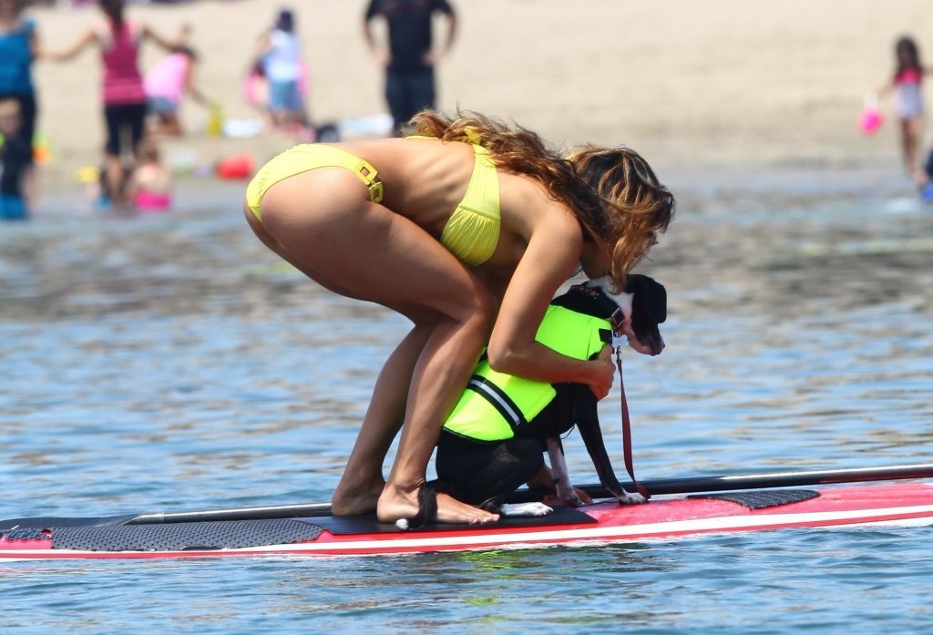 La belle anglaise est de retour et ce n’est pas pour une émission de télé mais plutôt pour du sport qu’elle pratique en compagnie de son chien sur une planche de surf.