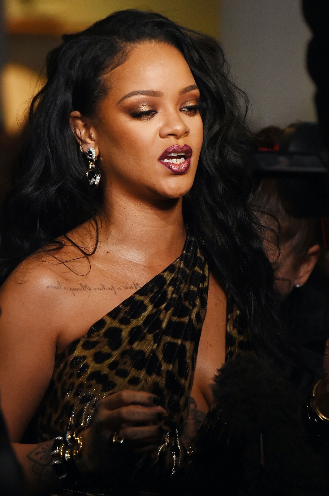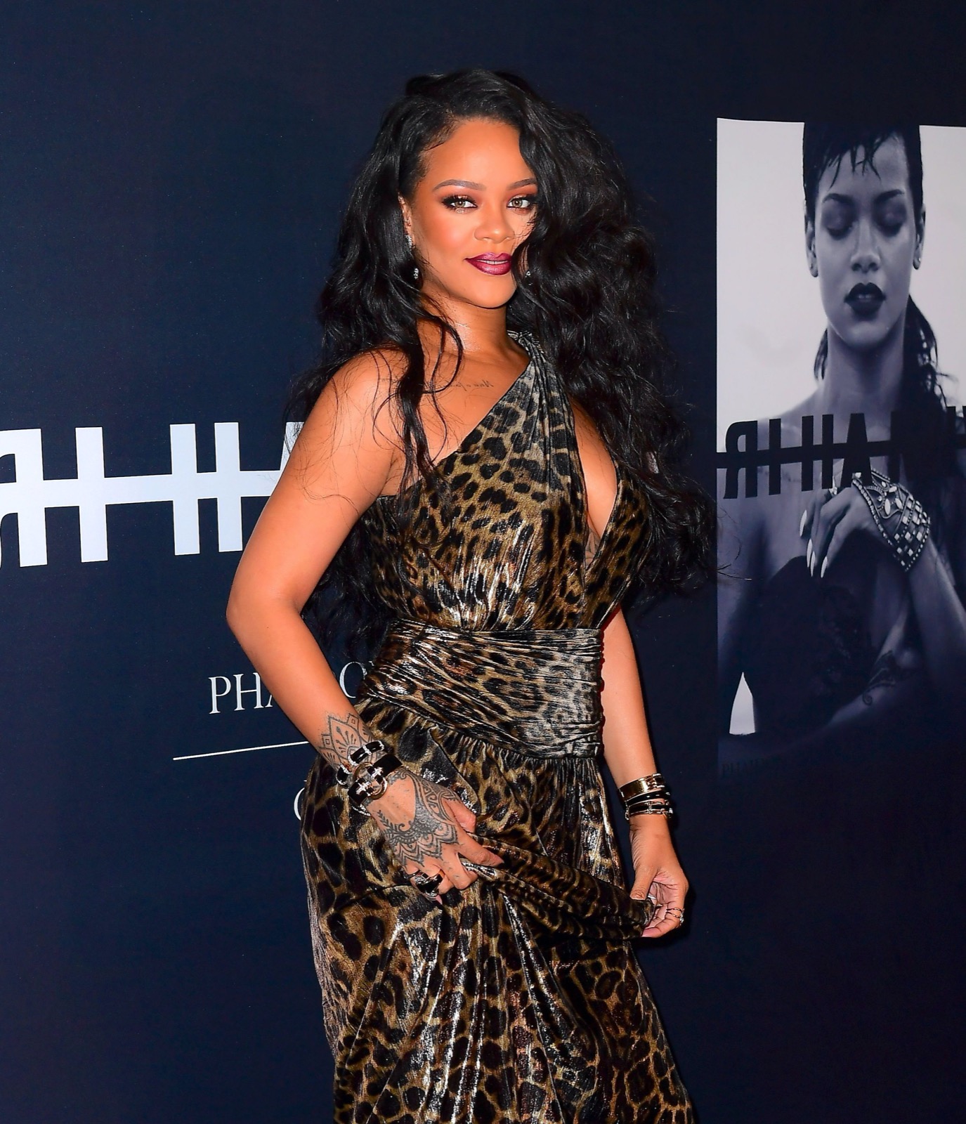 Rihanna était magnifique dans une robe à une épaule à imprimé léopard associée à des bottes hauteur genou.