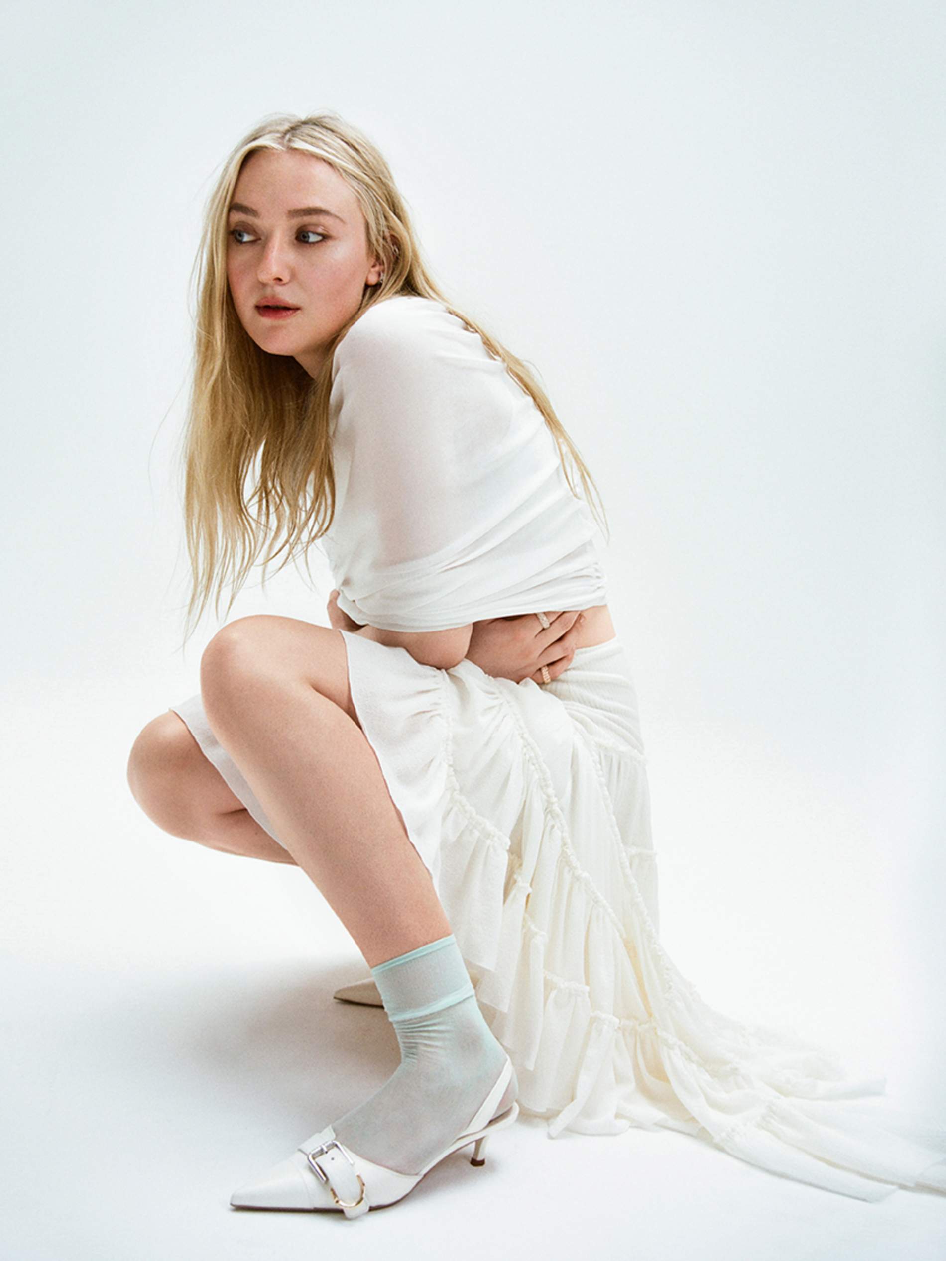 L’attitude décontractée de sa pose dit : "Je suis peut-être en tenue de gala, mais je suis prête à courir pieds nus dans l'herbe dès que l’occasion se présente." Dakota Fanning, la nymphe de Net-A-Porter, apporte la preuve qu'on peut sortir des bois enchantés et atterrir directement dans le cœur des fashionistas.