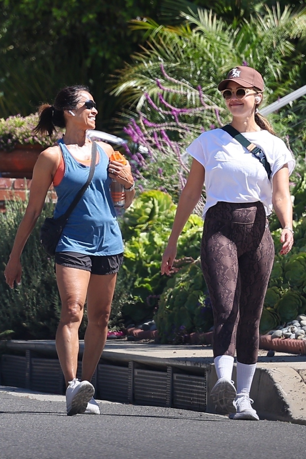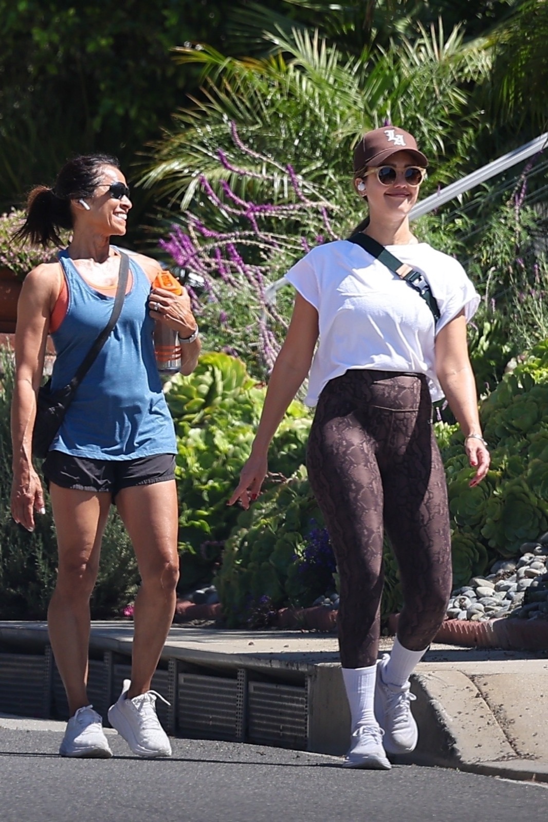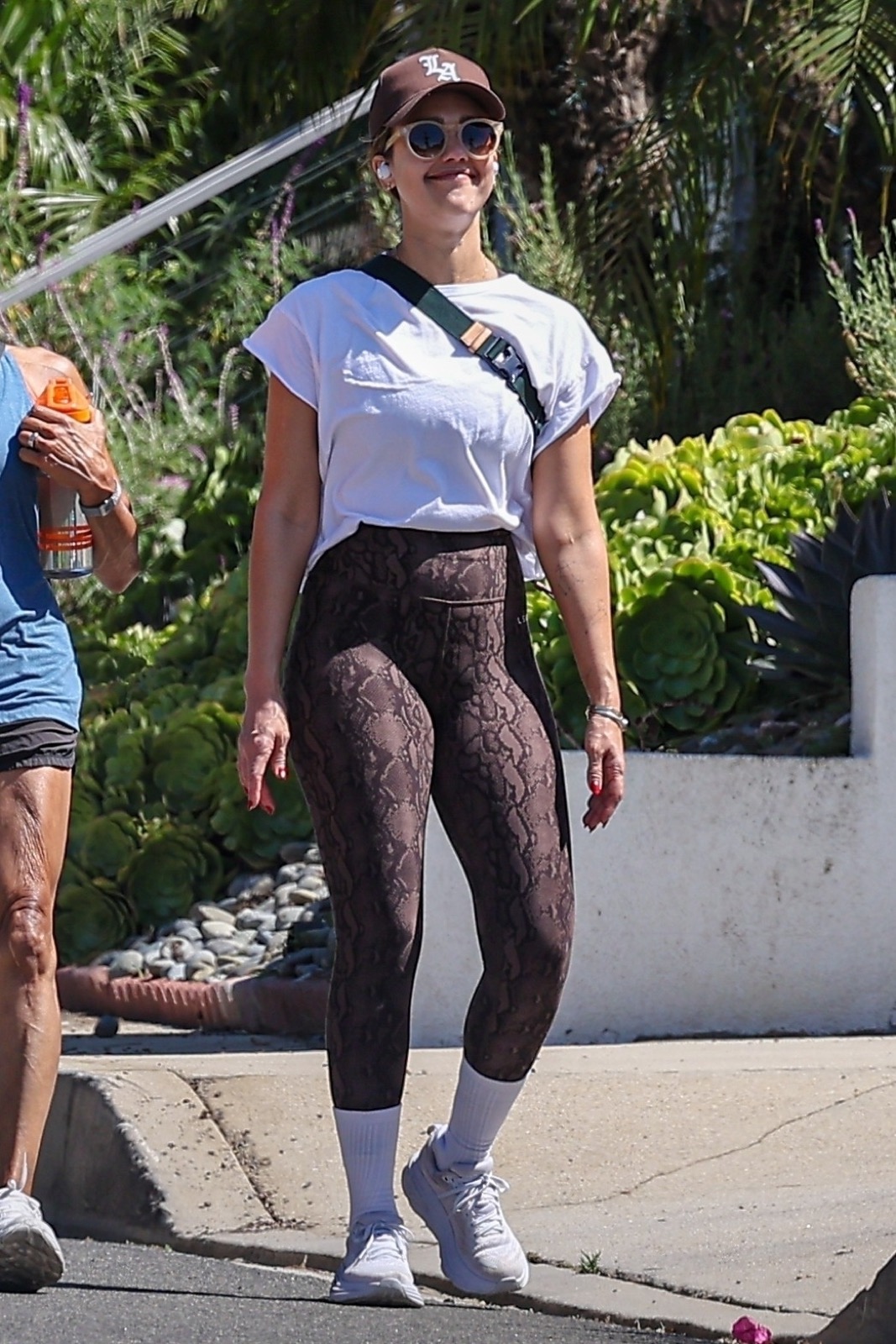Jessica, toujours un exemple de multitâche, arbore une gourde qui pourrait tout aussi bien contenir de l'eau de coco ou une potion magique bio. Accompagnée de son amie, elle affiche un sourire radieux, prête à conquérir les collines une marche à la fois. Ah, la vie simple des célébrités à Beverly Hills!