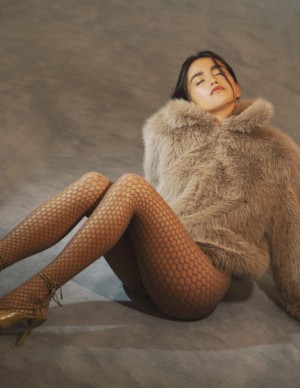 Sur la couverture, elle arbore un manteau en fausse fourrure si volumineux qu'il pourrait bien abriter un petit écosystème. Avec son crop top qui semble avoir été tricoté par une grand-mère fan de disco, Maia prouve qu'elle peut rendre n'importe quel vêtement tendance, même les plus improbables.