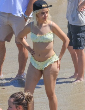 Avec son bikini à volants pastel et sa casquette noire vissée sur la tête, elle adopte un look "je suis en vacances, laissez-moi tranquille" tout en restant étonnamment cool.