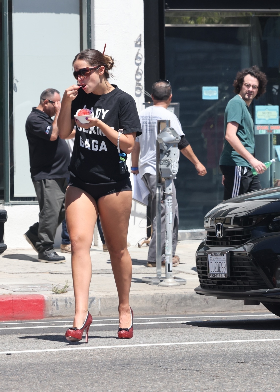 Qui a besoin de pantalons quand on a un t-shirt "Lady Fucking Gaga" aussi percutant ? Avec son dessert glacé à la main et ses lunettes de soleil dignes d'une star, Addison maîtrise l'art de "je m'en fiche du regard des autres" à la perfection.