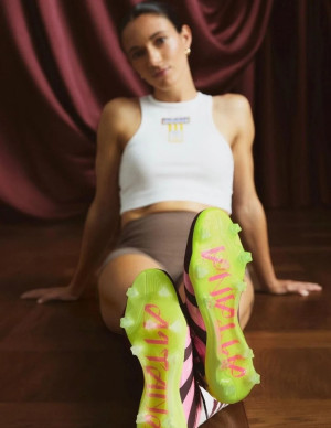 Avec un mélange subtil de charme et de détermination, Aitana Bonmati pose fièrement pour Adidas, entourée de son arme secrète : des crampons par dizaines !