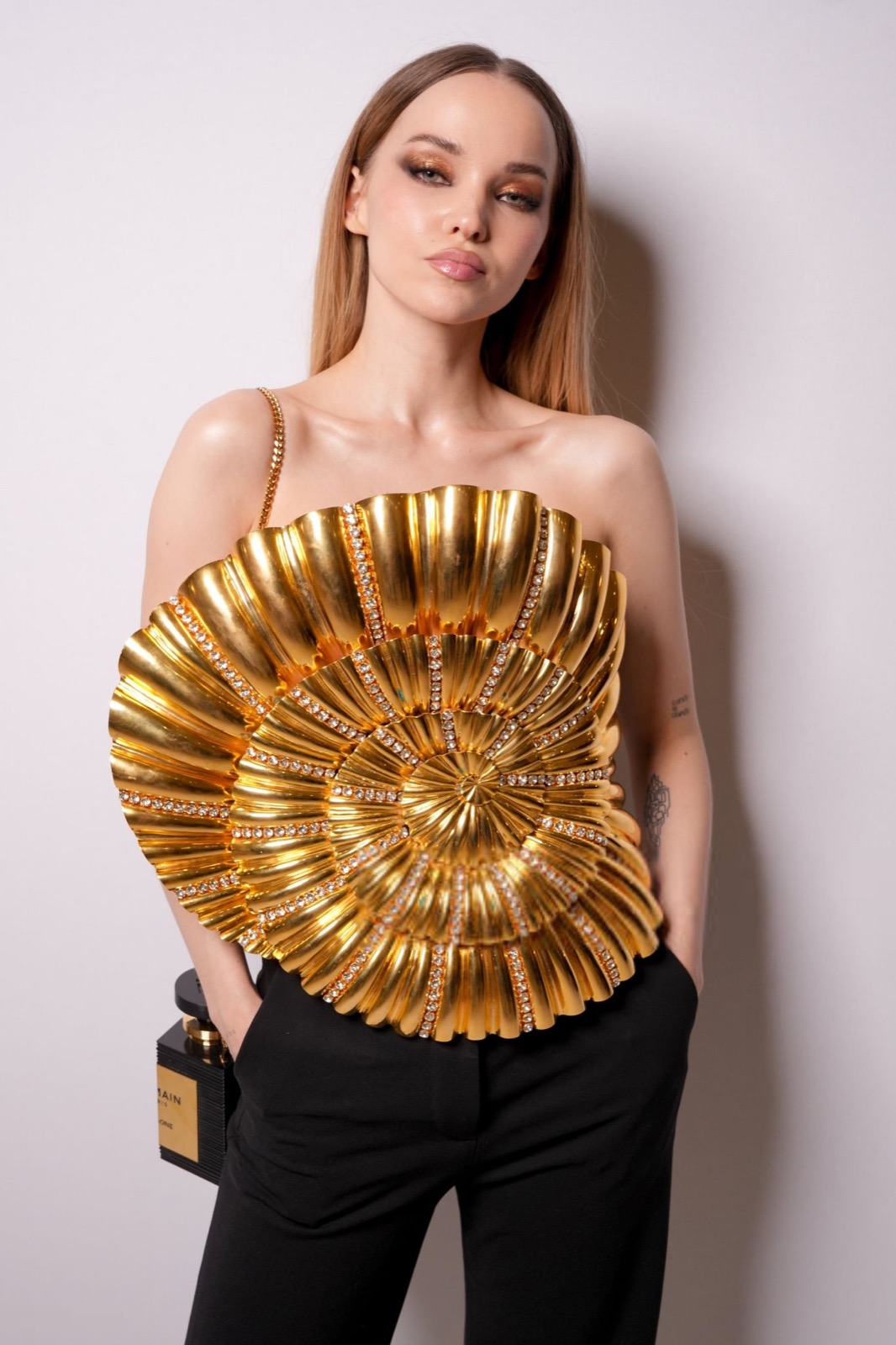 Avec ce top qui évoque une coquille Saint-Jacques en or massif, elle semble prête à remporter le prix de "l'invité la plus lumineuse" de la Fashion Week. On espère juste que personne ne lui a demandé de s'asseoir trop confortablement... Ce qui est certain, c'est que Dove a attiré tous les regards.