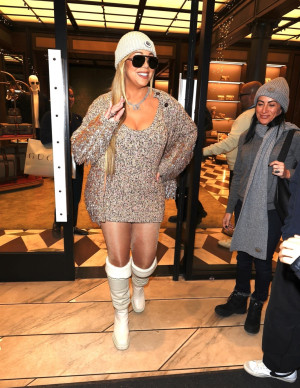 En plein hiver, elle arbore un ensemble aussi flashy que confortable : un pull-cardigan à paillettes qui semble dire "je brille même sous la neige", des leggings brillants pour ne pas oublier qu'elle est une star, et des bottes en moumoute pour garder les pieds au chaud.
