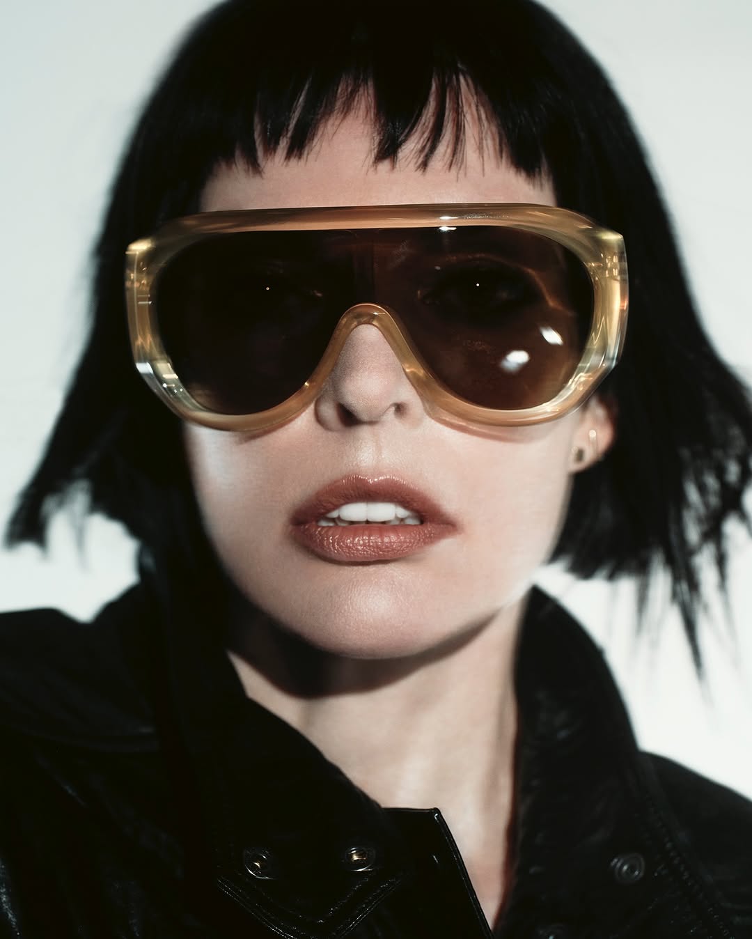 Posant sur une chaise comme une guerrière futuriste, elle défie la gravité avec des ceintures à œillets qui semblent sorties d’un vaisseau spatial en panne.