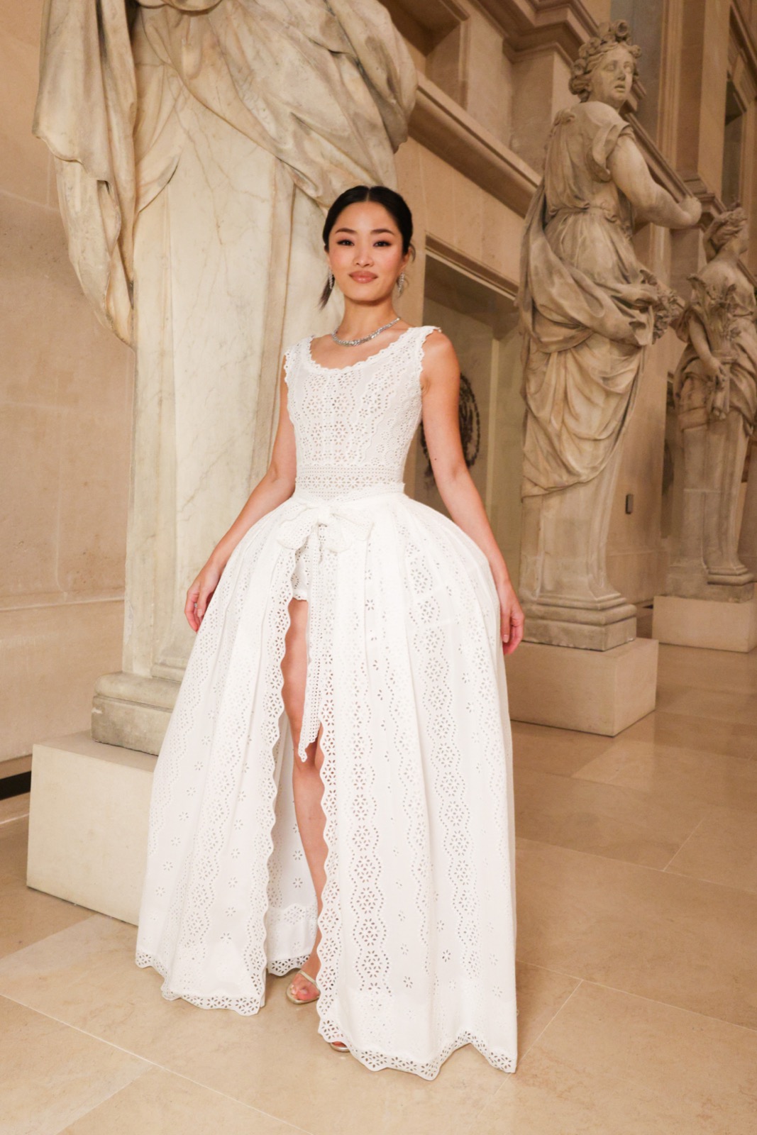 Anna Sawai au Grand Dîner du Louvre, dans une robe en dentelle blanche qui crie « je suis une statue vivante, mais plus stylée » !