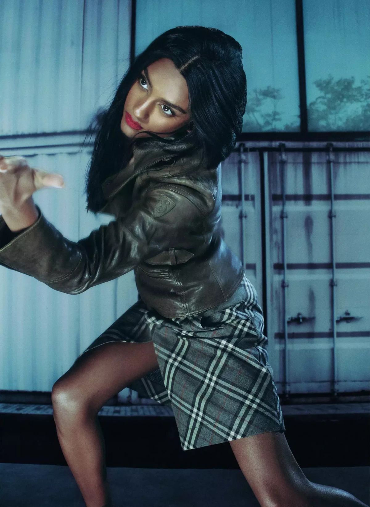 Et cette seconde photo, avec sa veste en cuir et sa jupe à carreaux, on dirait qu’elle s’entraîne pour un rôle de détective chic dans une série Netflix.