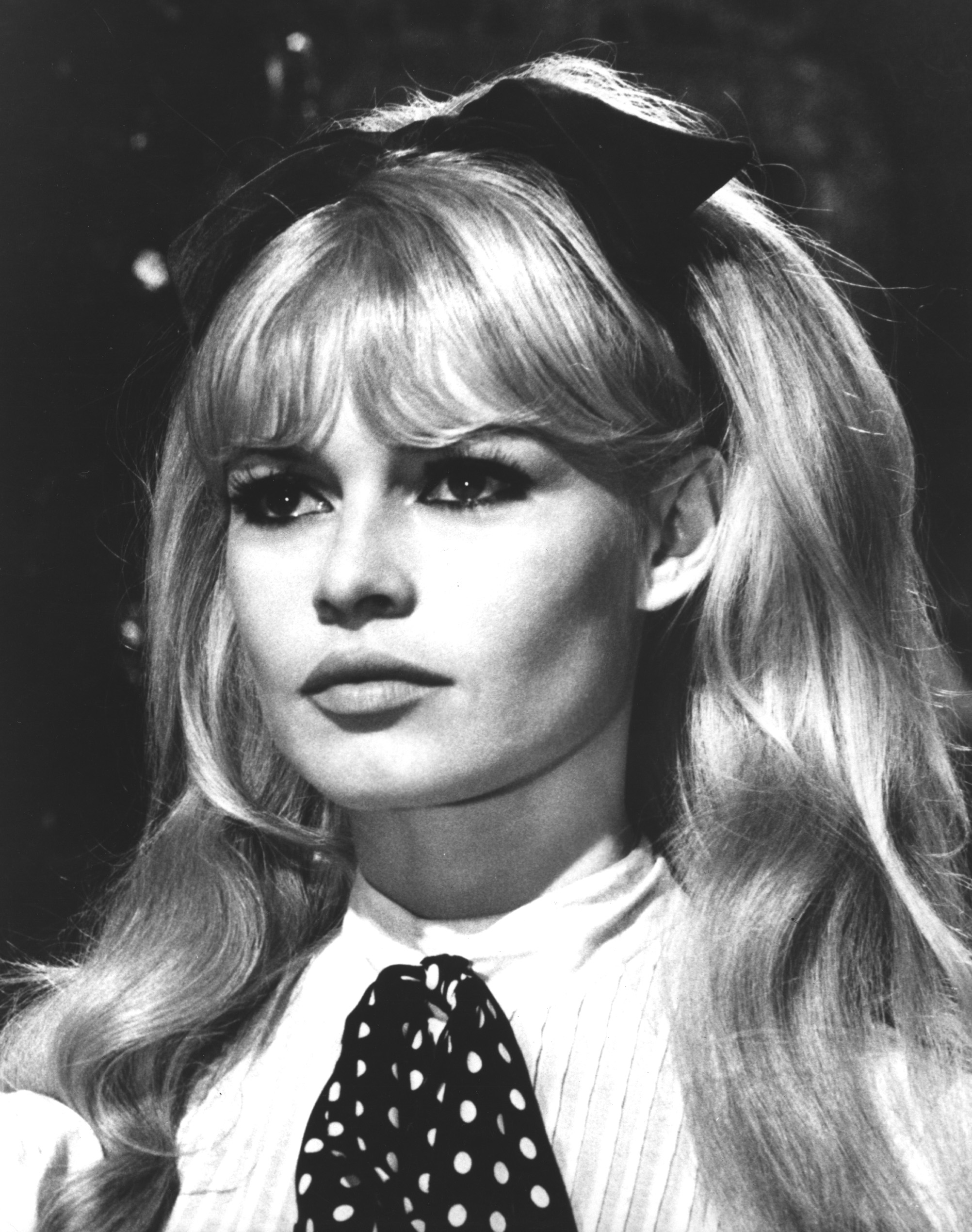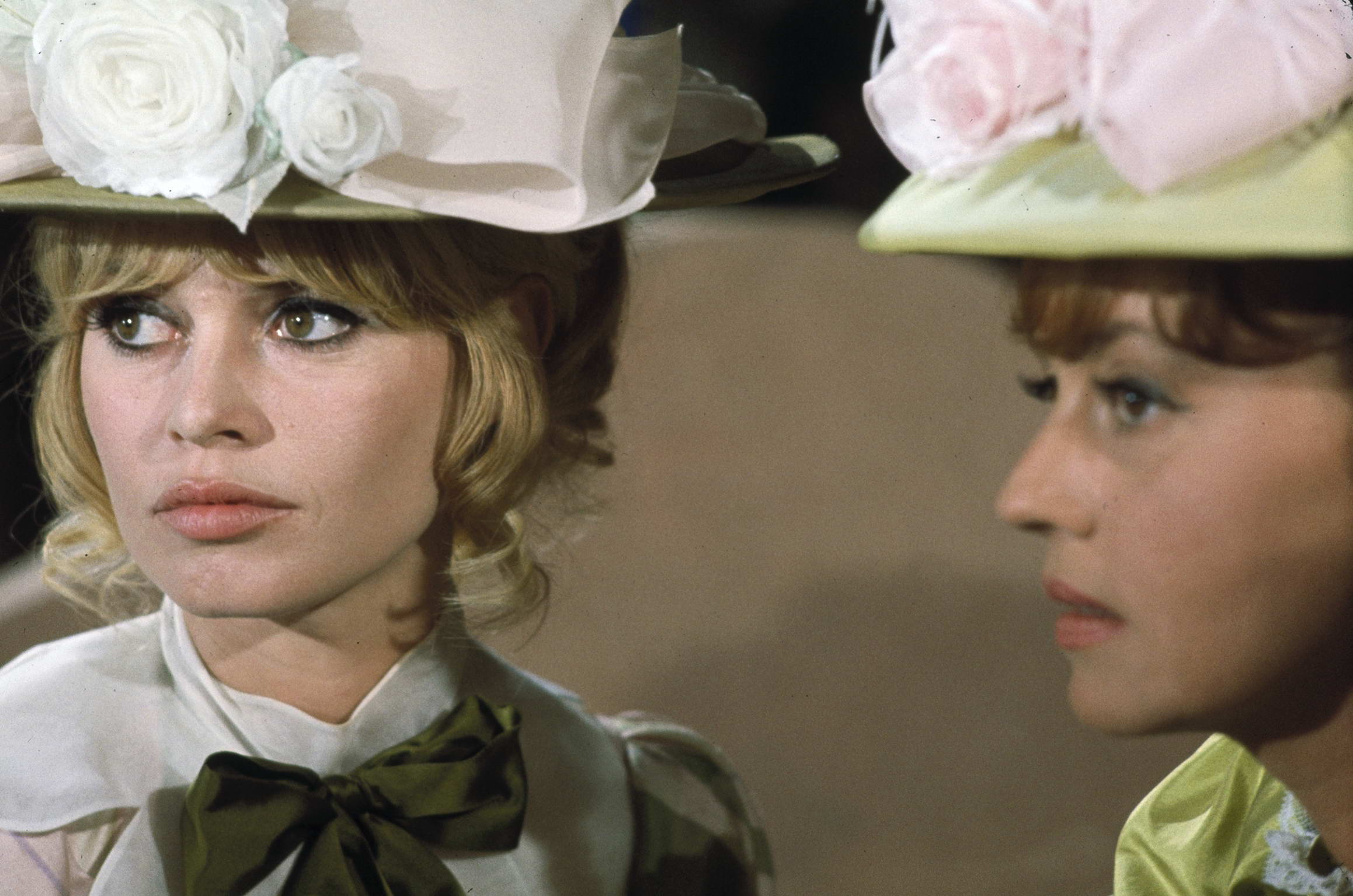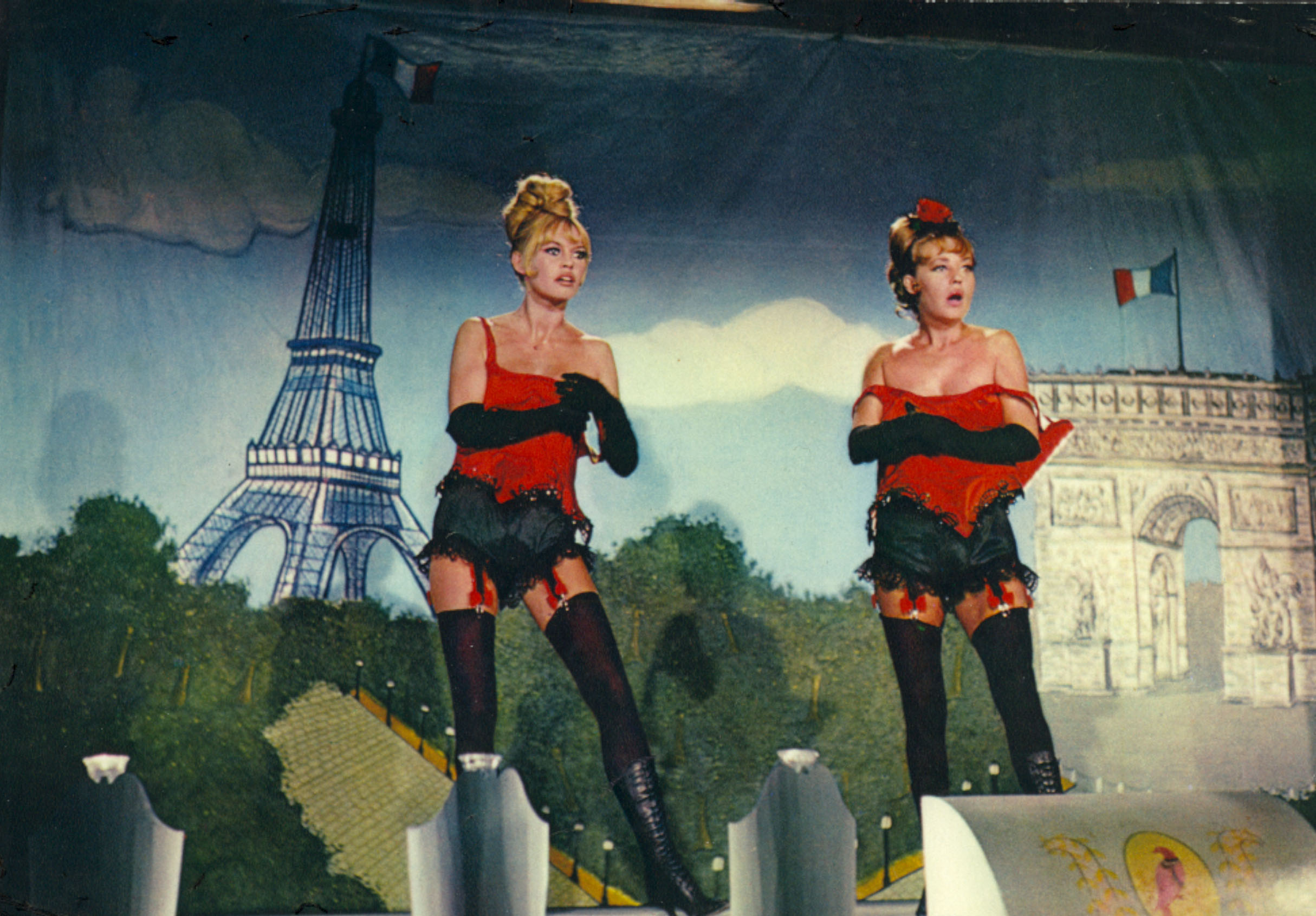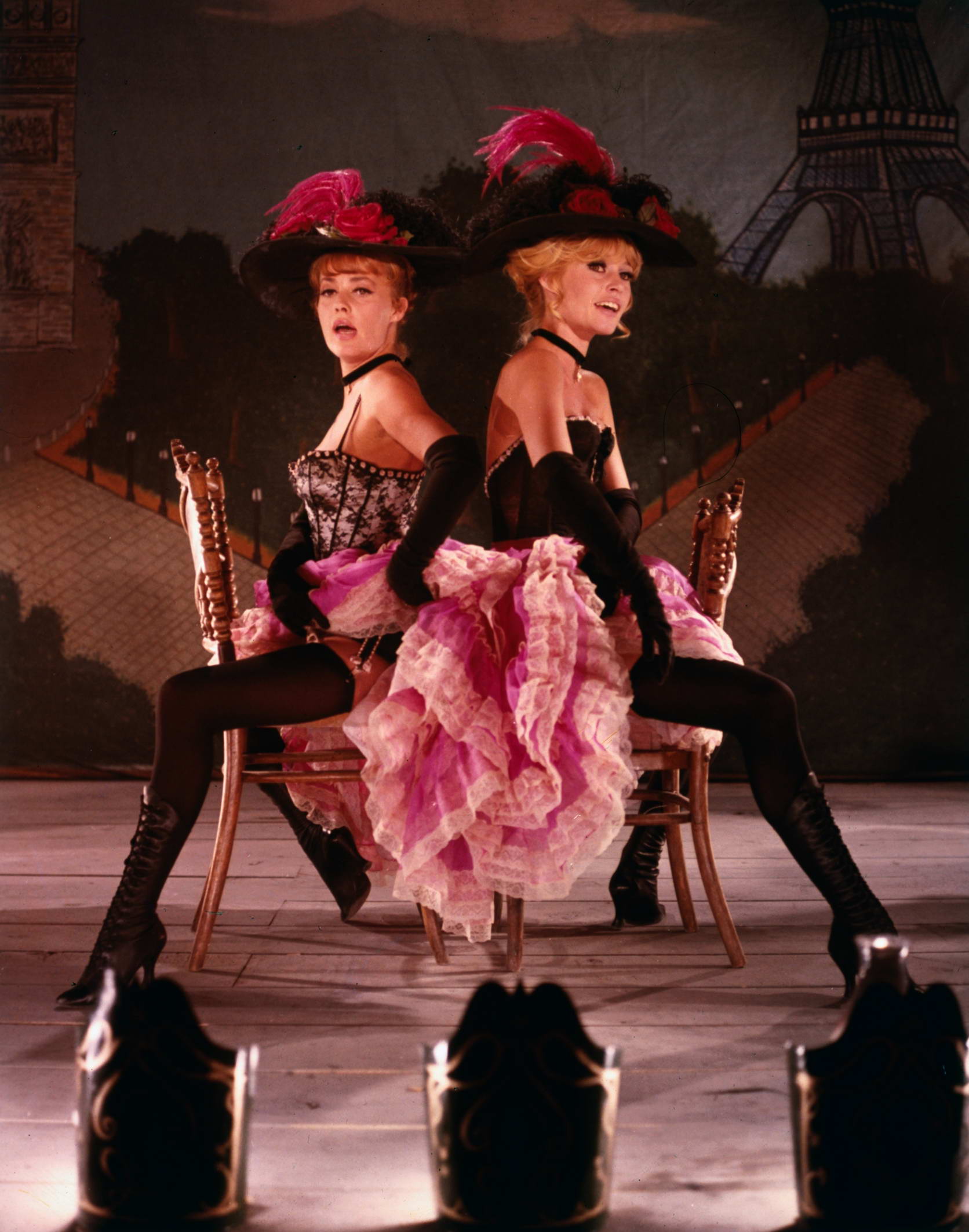 En 1965, Brigitte Bardot joue la carte cabaret armé : corset, jupon rose et chapeau à plumes. Même assise, elle déclenche l’émeute. La pose sourit, le décor tremble.