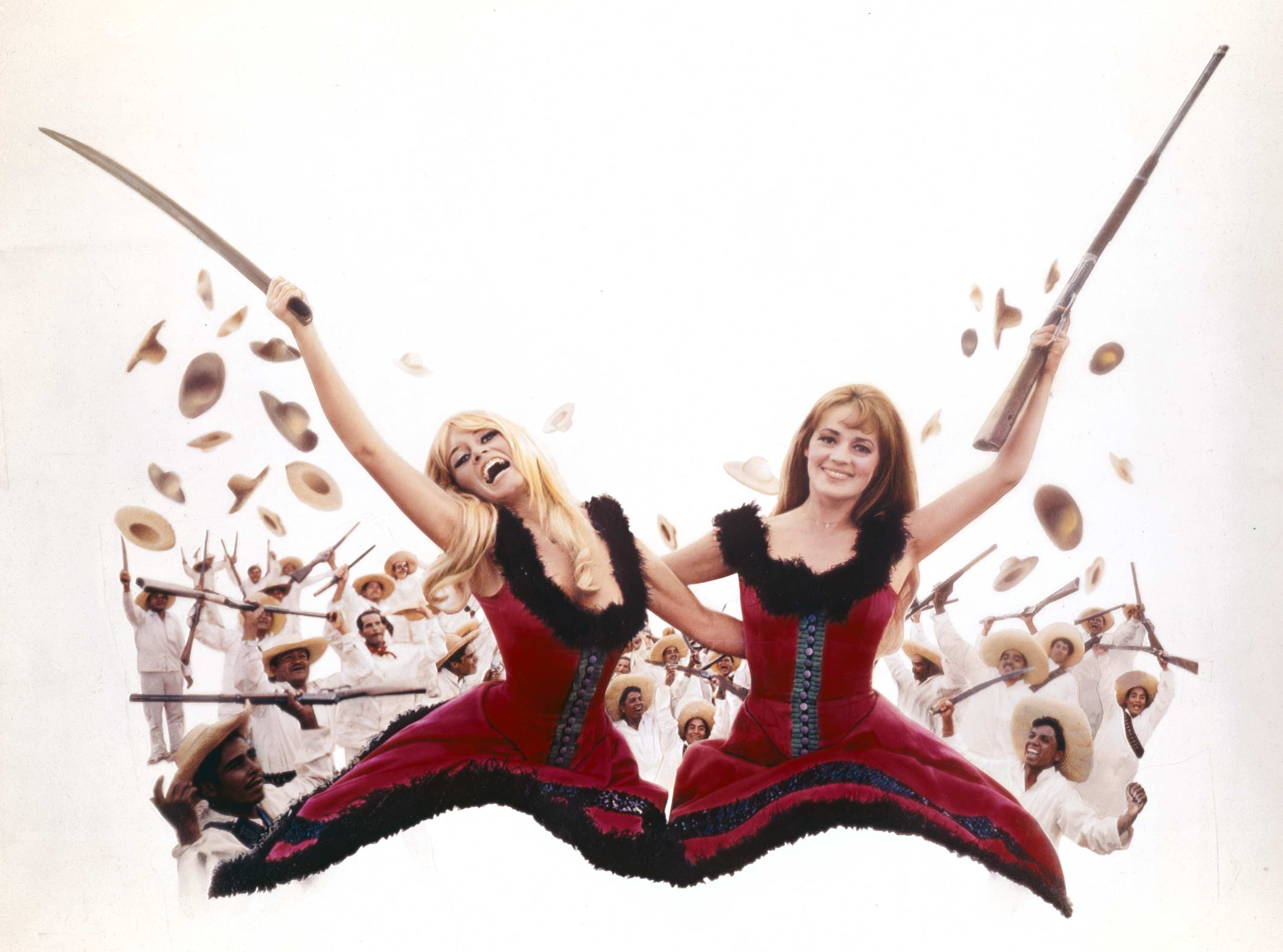 Ces images accompagnent le film Viva Maria!, comédie d’aventure explosive signée Louis Malle. Deux héroïnes, de la poudre, du panache : le cinéma français flirte avec l’insolence latino.