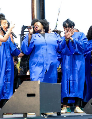 Sa robe scintillante crie "je suis une déesse", mais on dirait qu’elle a oublié de dire à la chorale derrière elle qu’on n’était pas à une remise de diplômes.