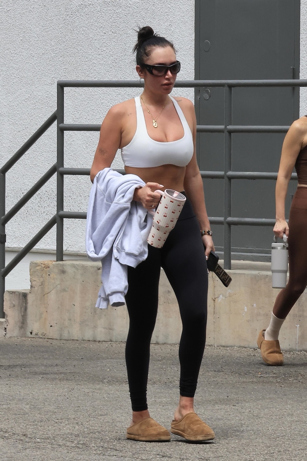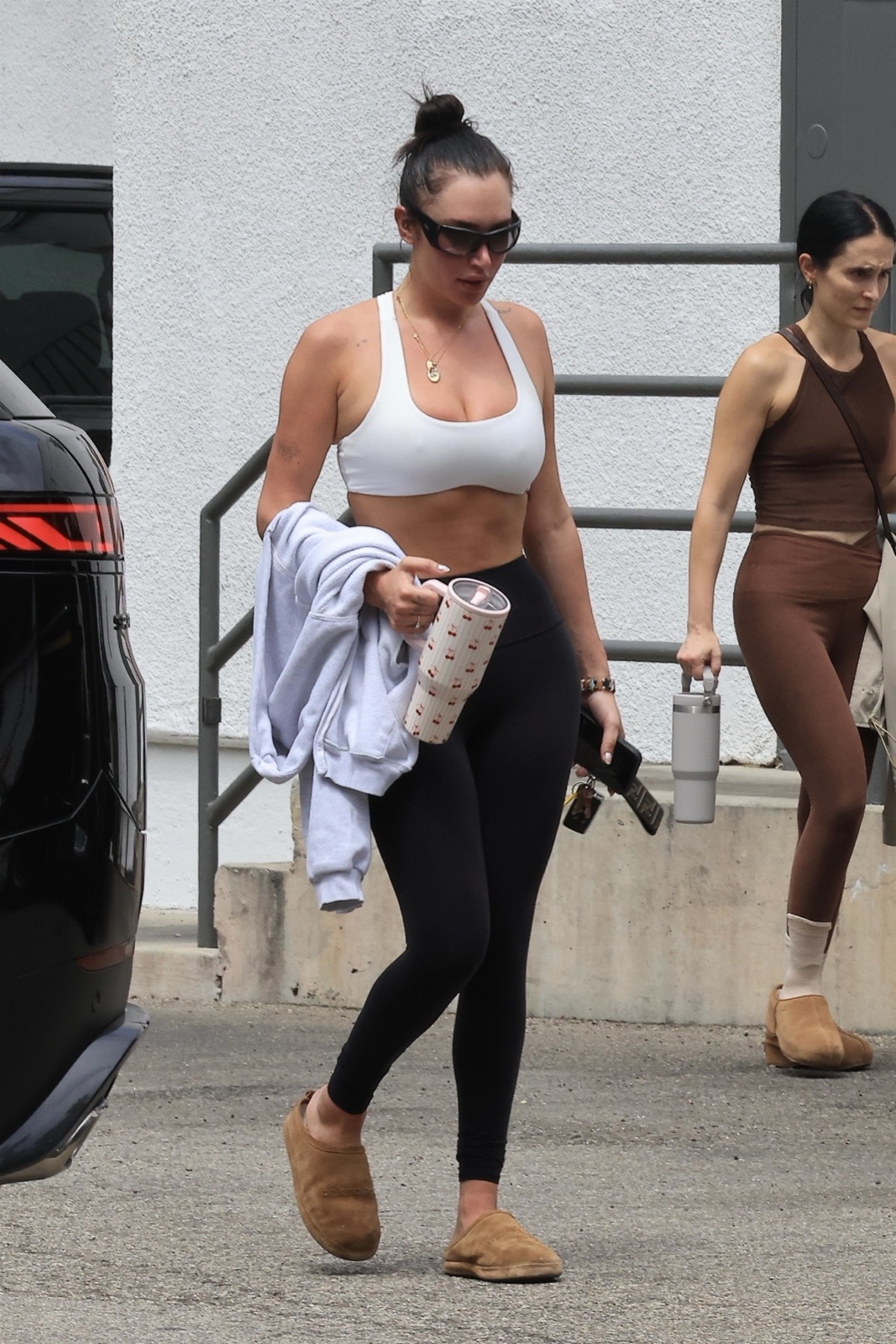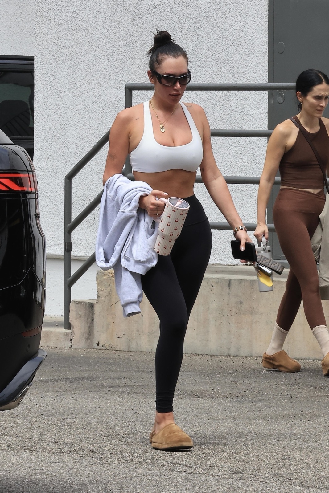 Le bitume de Los Angeles n’a jamais vu yoga plus torride. En brassière blanche et leggings noirs, Anastasia Karanikolaou transforme la sortie de Pilates en scène d’adoration corporelle.