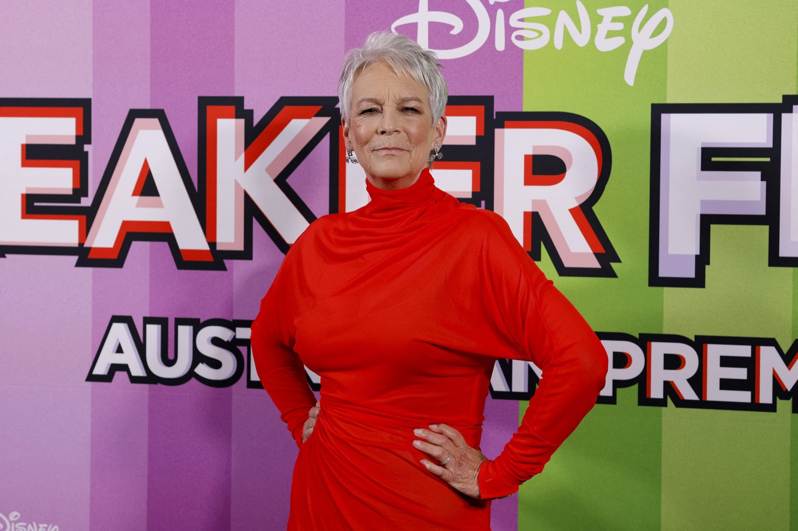 Jamie Lee Curtis débarque à la première australienne de Freakier Friday comme si elle venait d’être nommée reine officielle du rouge flamboyant.