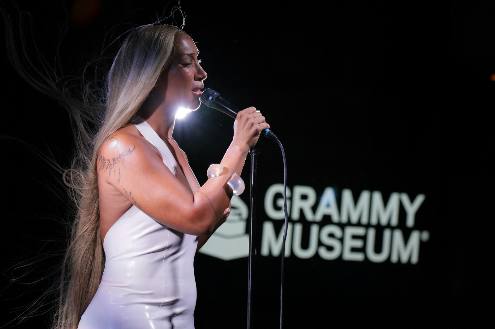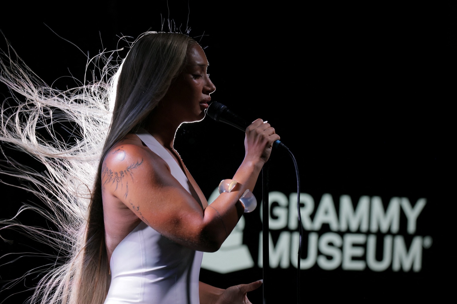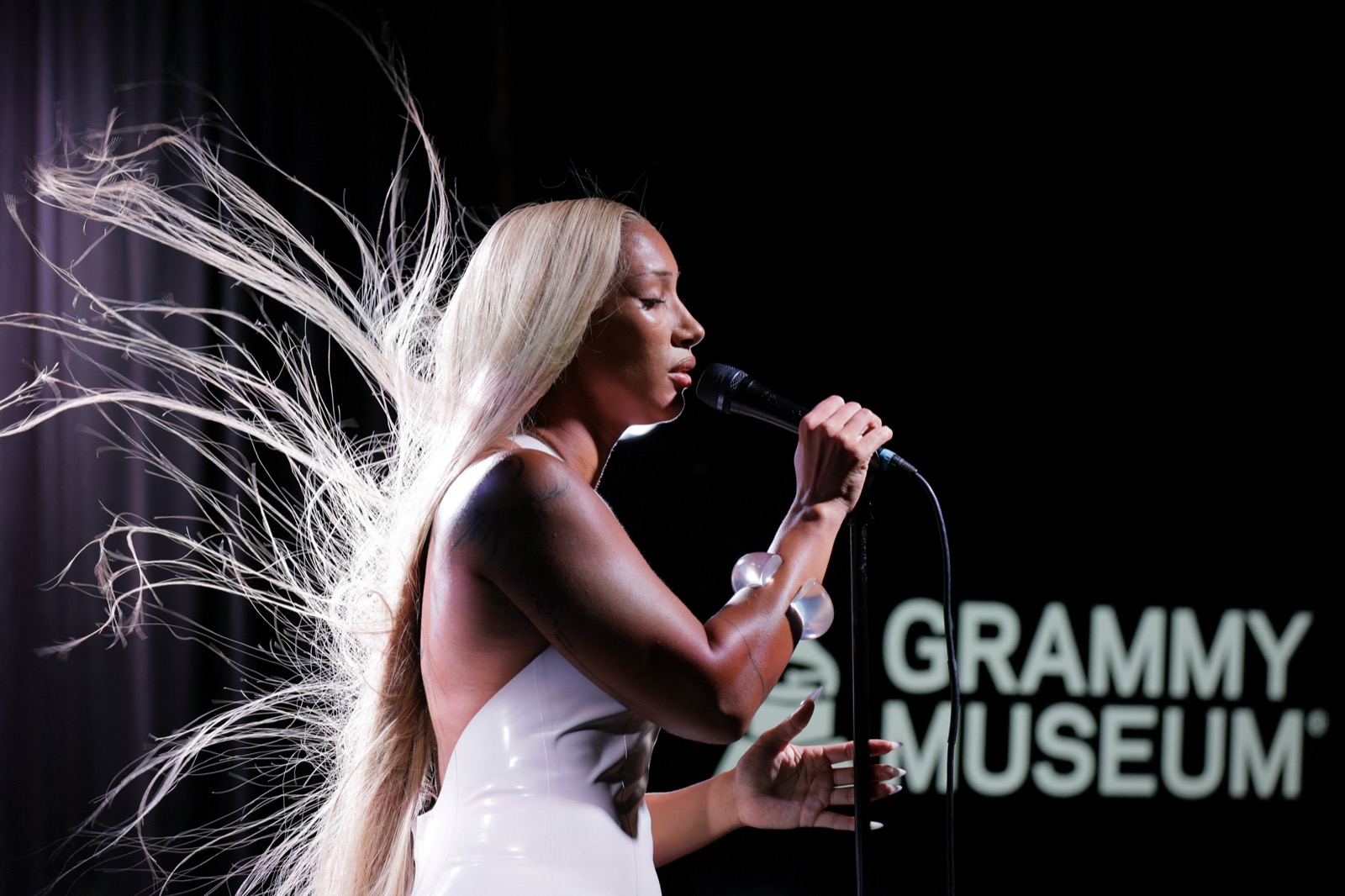Naomi Sharon transforme le Spotlight du GRAMMY Museum en véritable podium personnel, moulée dans une robe blanche au décolleté vertigineux qui semble directement conçue pour fusionner avec la lumière des projecteurs.