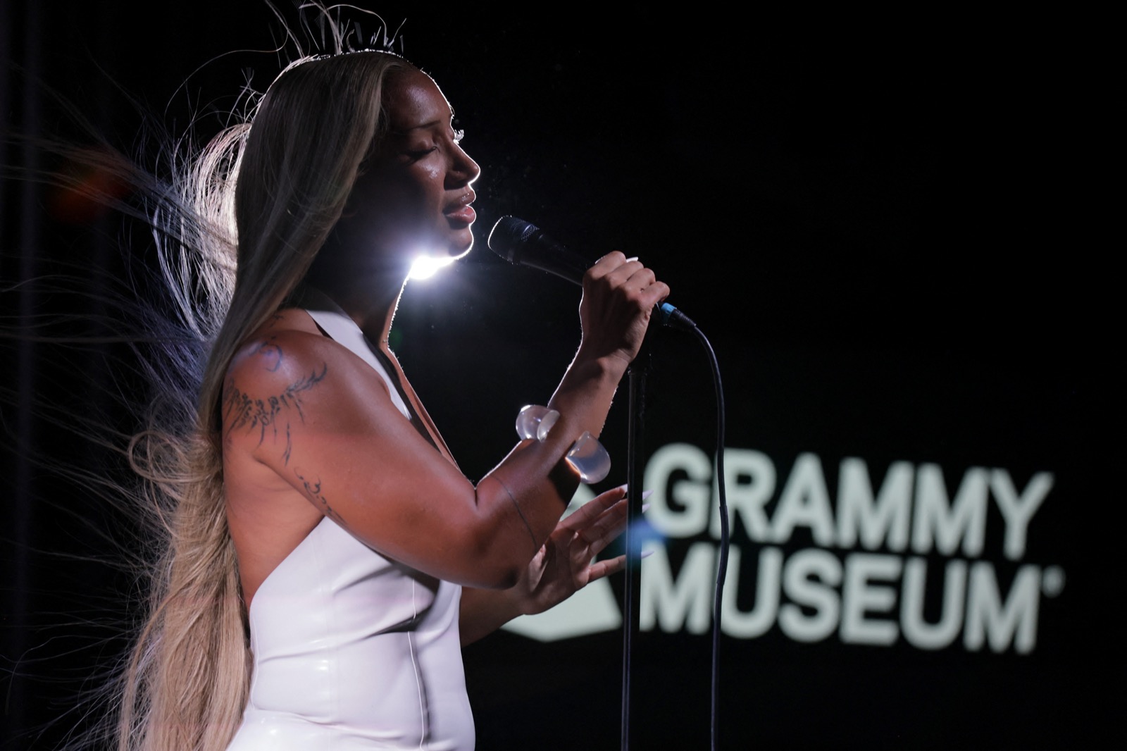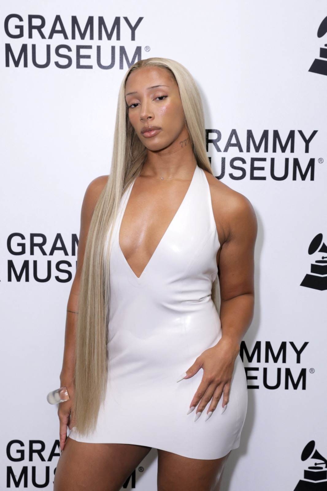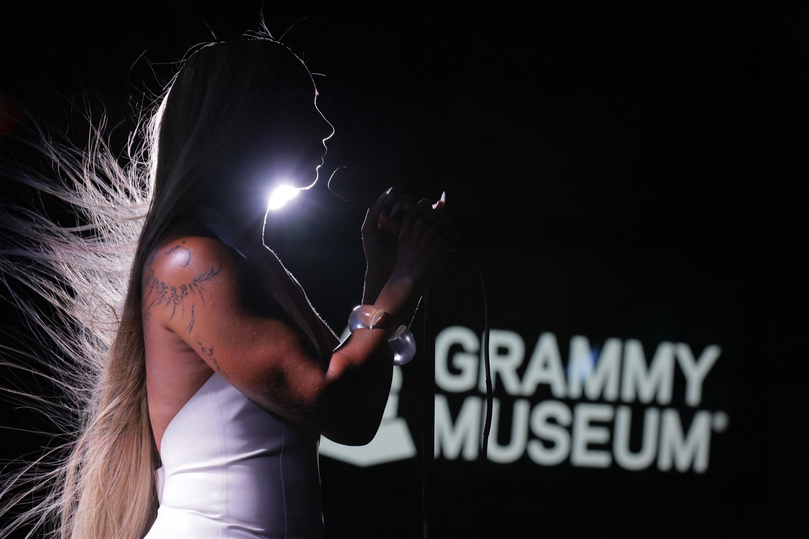 Naomi Sharon transforme le Spotlight du GRAMMY Museum en véritable podium personnel, moulée dans une robe blanche au décolleté vertigineux qui semble directement conçue pour fusionner avec la lumière des projecteurs.