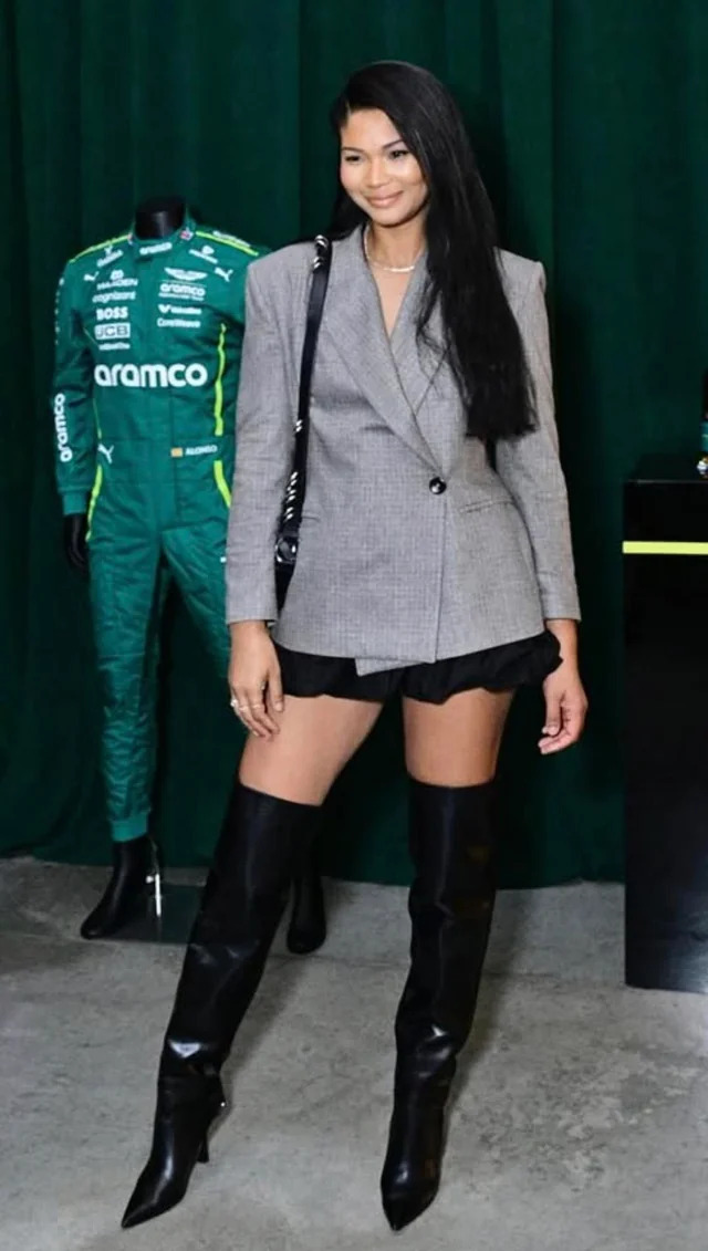Et pendant que la Formule 1 ronronne en arrière-plan, c’est elle qui accélère les battements : une muse en cuissardes, mélange explosif de business meeting et de fantasme mondain.