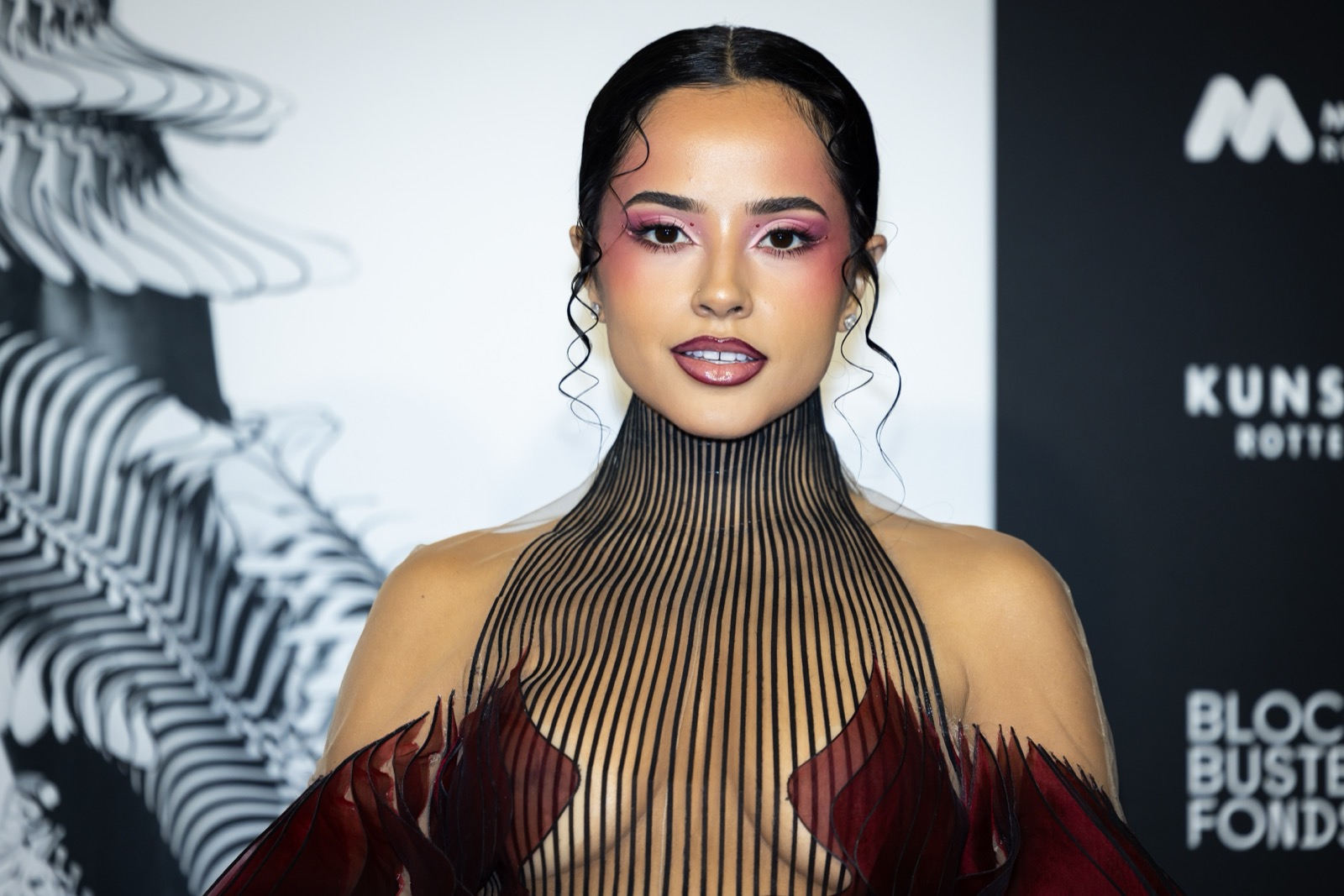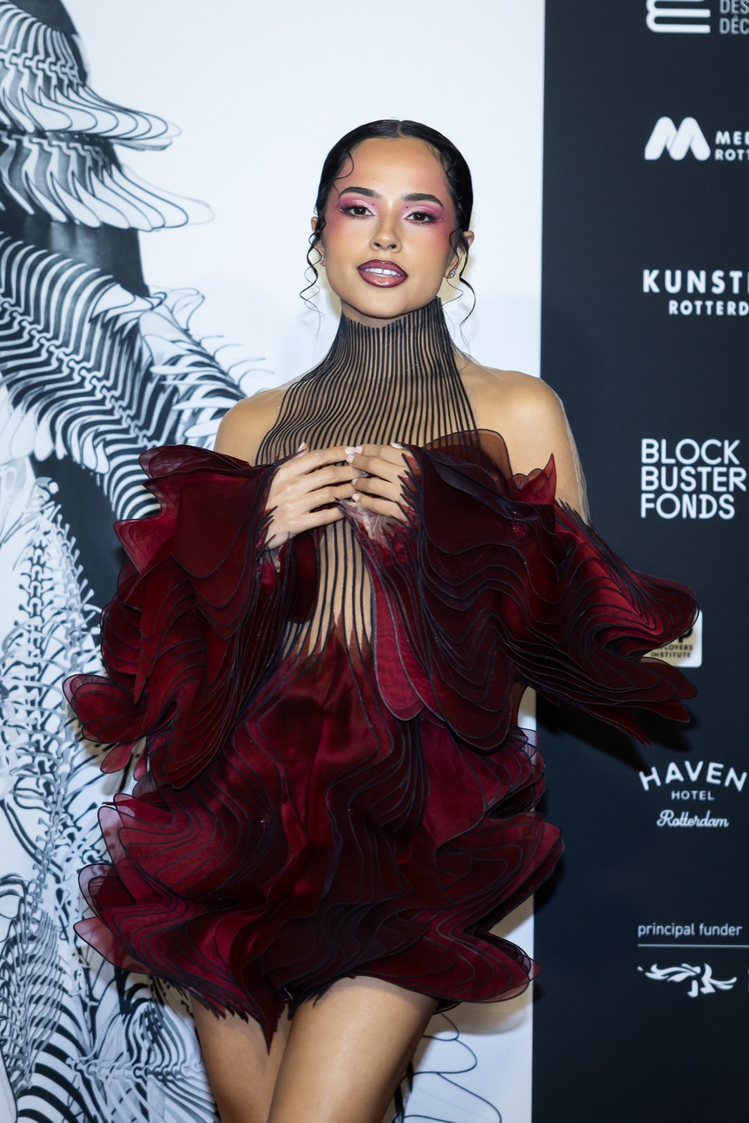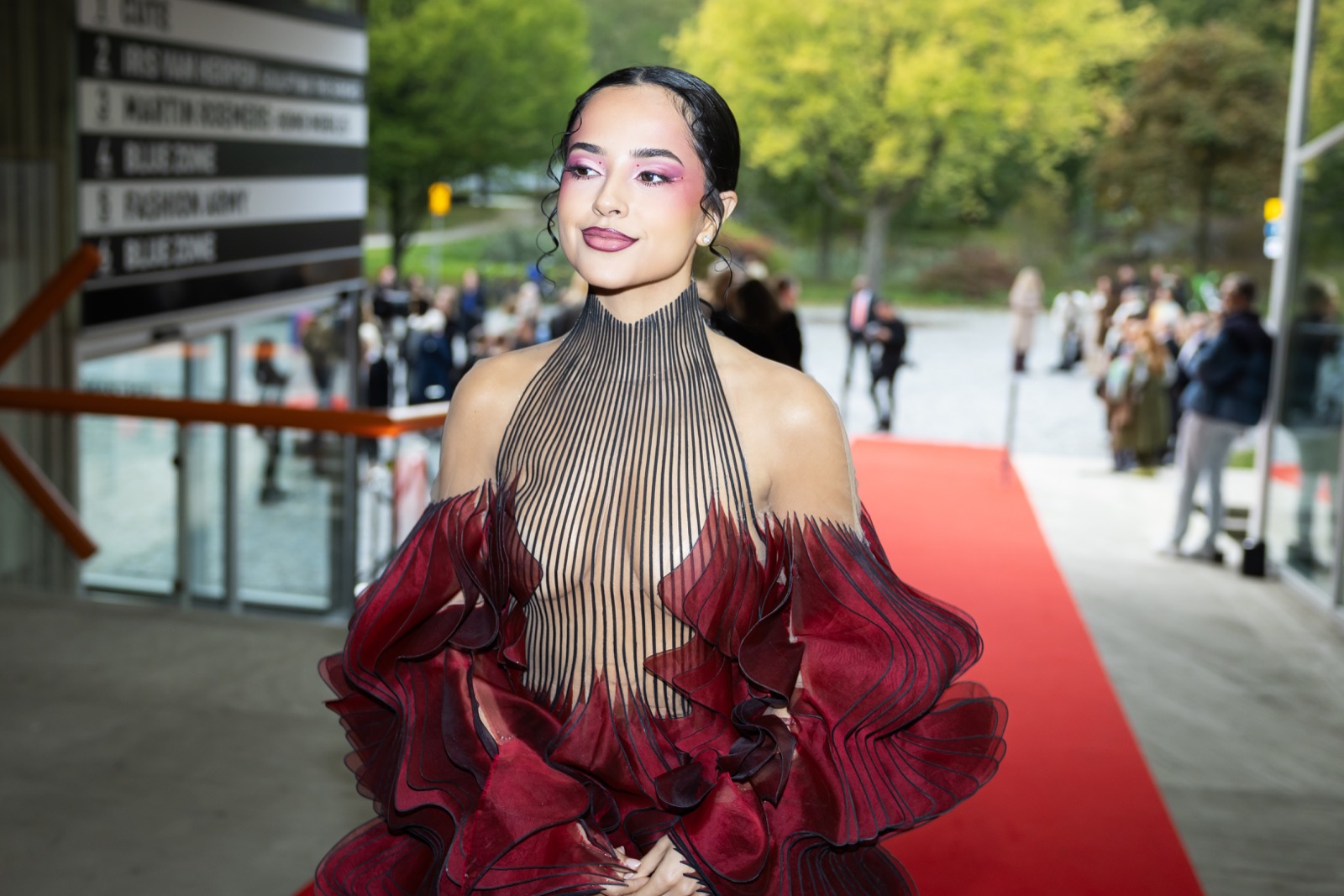 Dans cette robe qui ressemble plus à une éruption volcanique qu’à un vêtement, Becky G transforme le tapis rouge en coulée de lave sensuelle. Chaque pli flamboyant s’accroche à ses courbes comme un péché assumé, pendant que le col graphique, rigide et impitoyable, lui sculpte une allure de prêtresse futuriste.