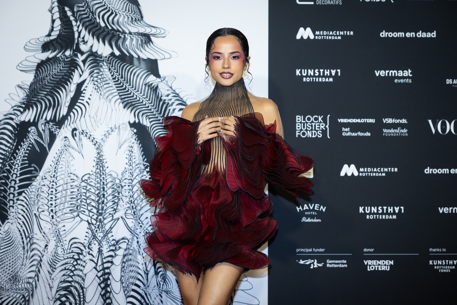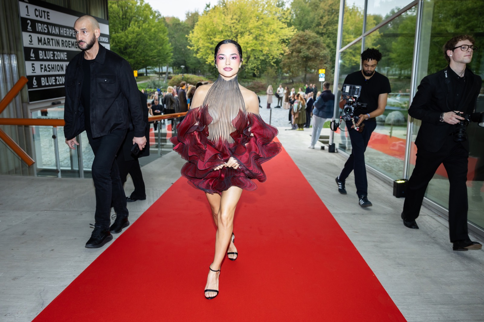 Le contraste est violent : derrière son sourire sage, on devine une héroïne de soap interstellaire, égarée entre les galaxies du Kunsthal et les flashs des photographes en transe. Sa démarche est celle d’une diva cosmique, mélange de mannequin mécanique et de déesse antique réinventée par un couturier halluciné.