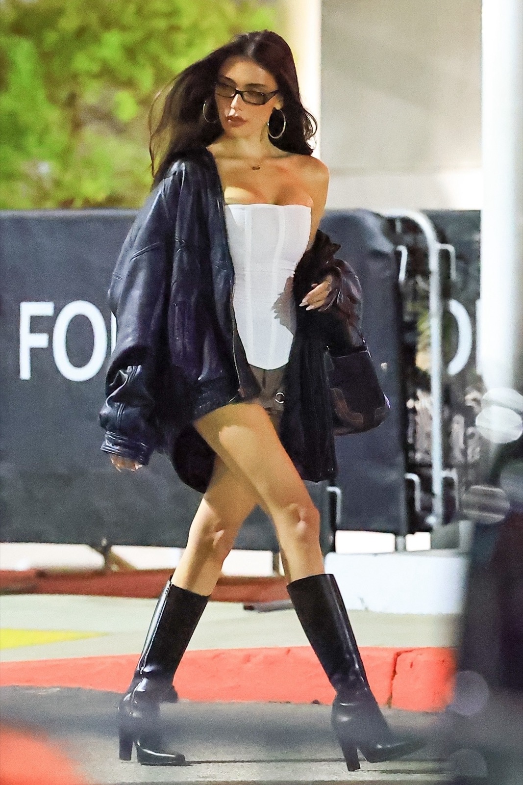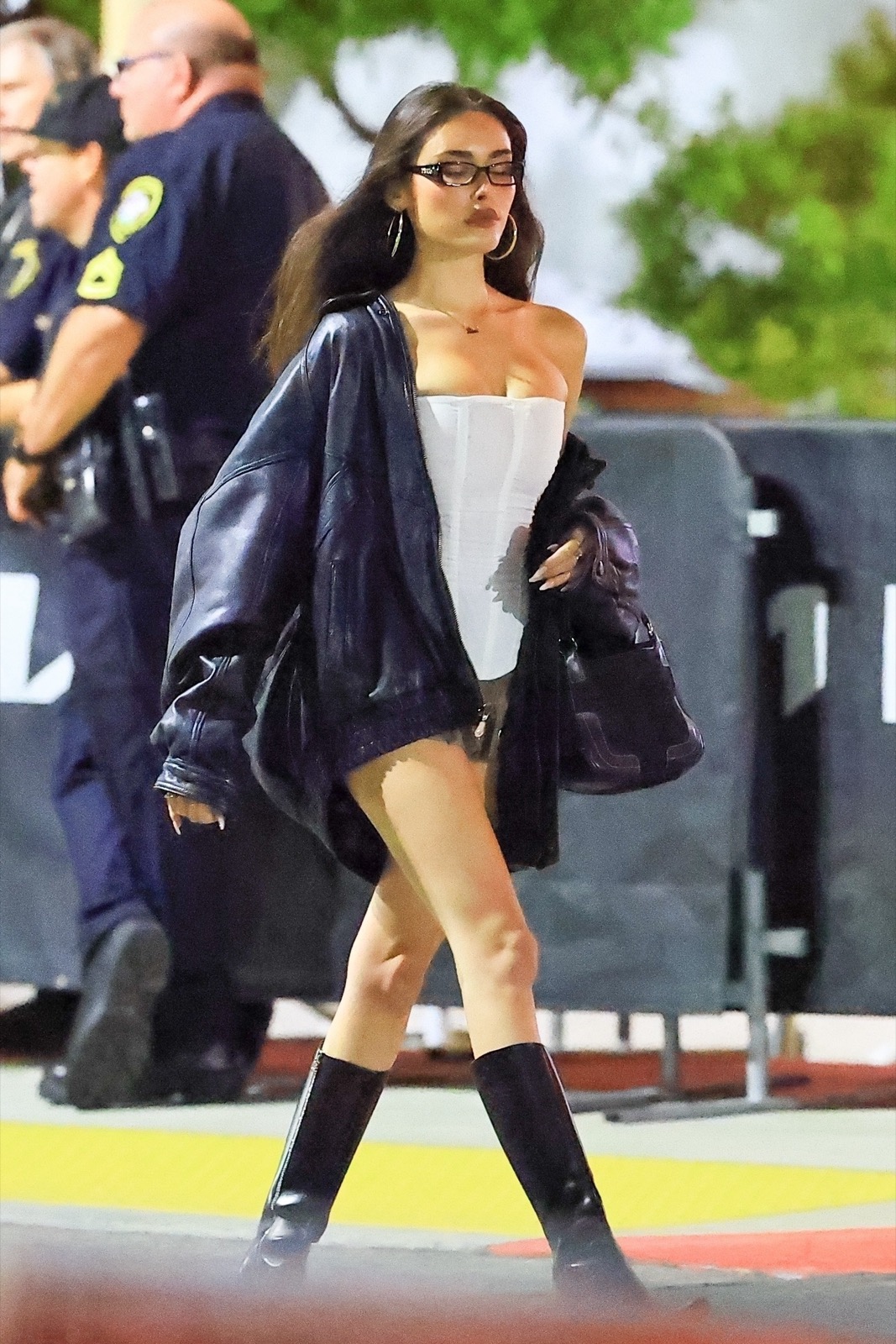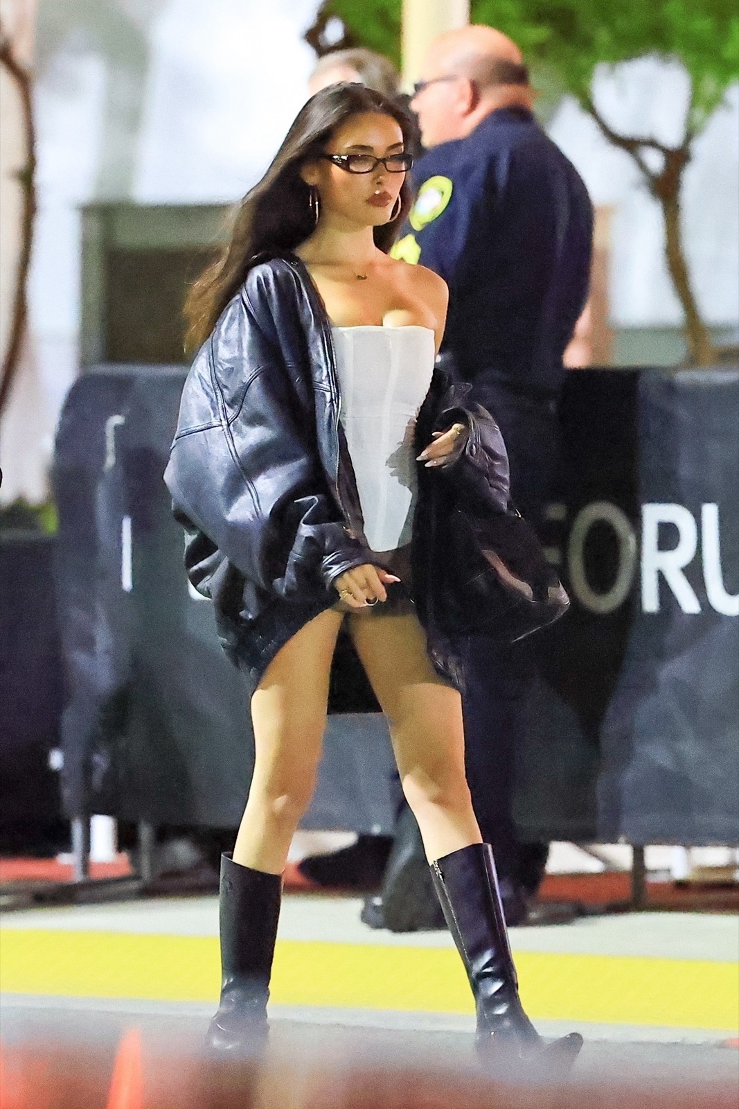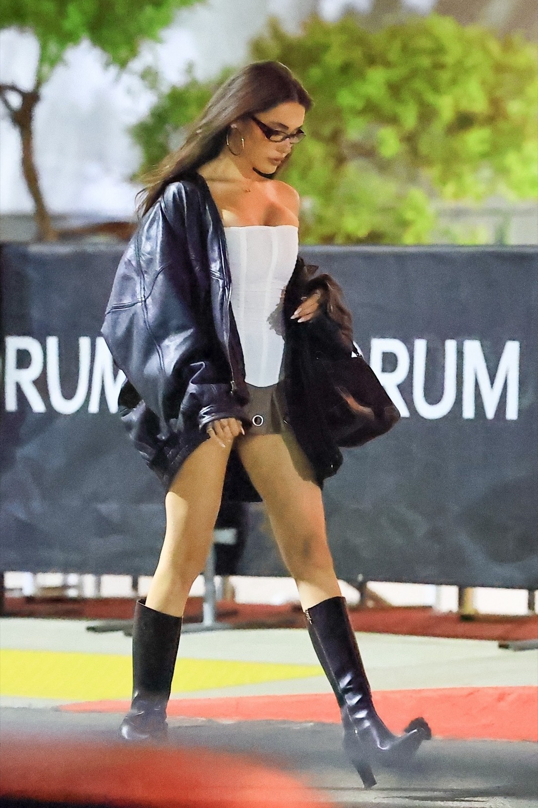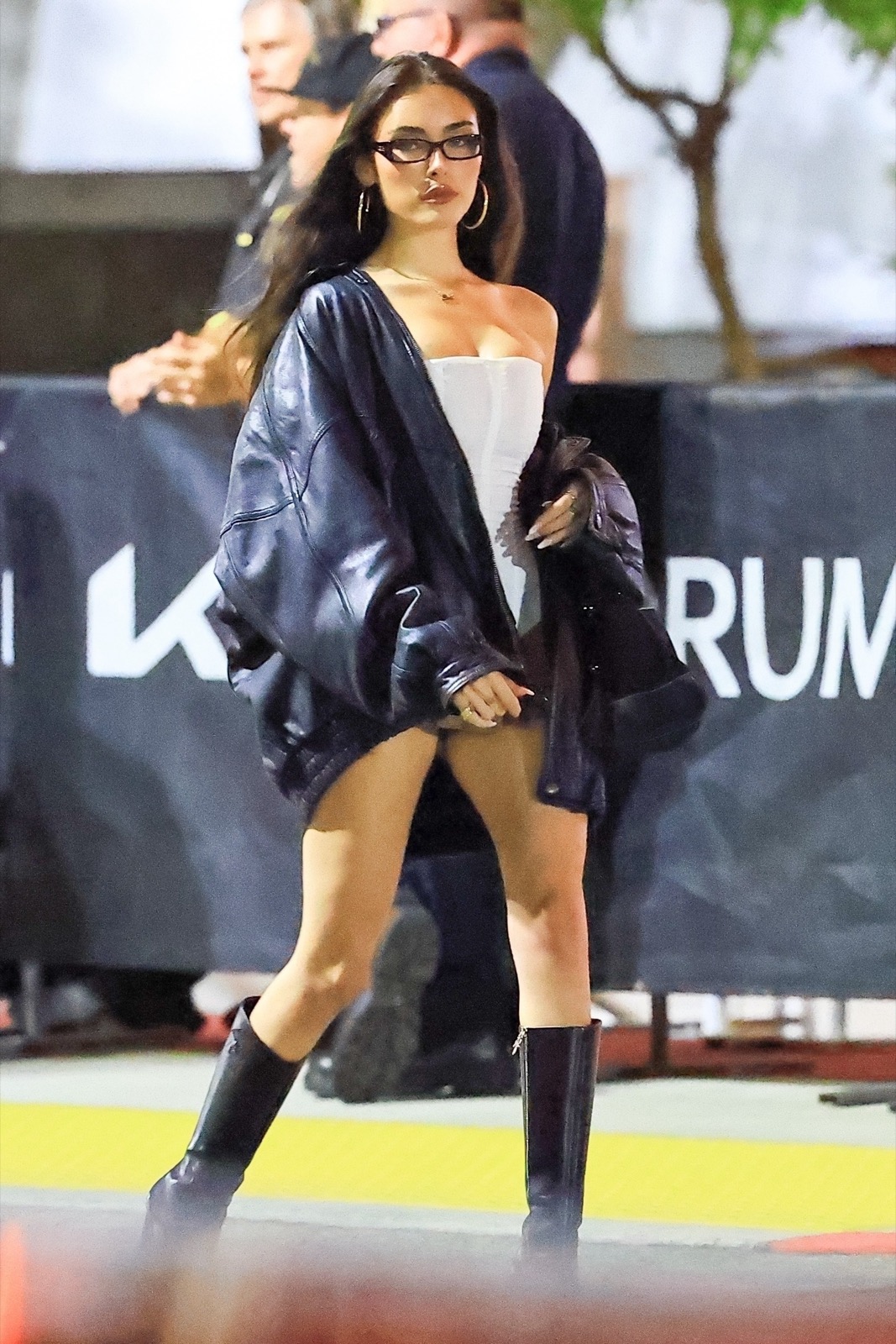 Un corset blanc qui comprime les regards, une mini-jupe qui disparaît presque dans la nuit, et ce blouson XXL tombant comme une provocation étudiée. Madison ne se contente pas d’assister, elle vampirise l’entrée.