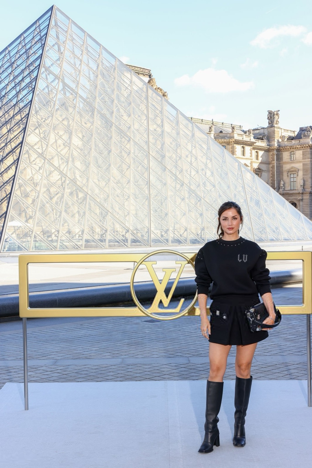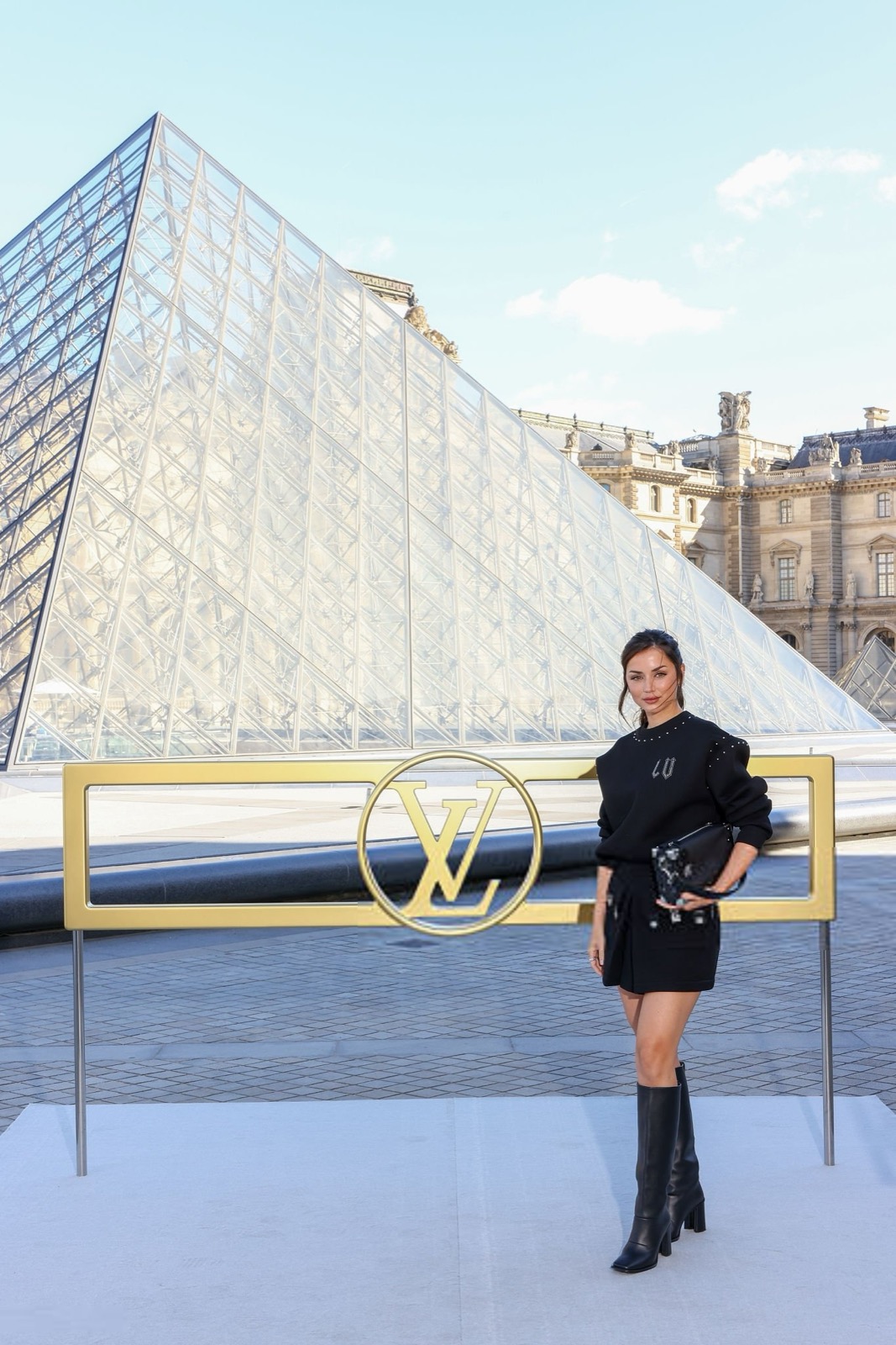 Mini-jupe militaire, pull oversized et logo Louis Vuitton en étendard discret : Ana transforme la cour du Louvre en podium de pouvoir, entre douceur et domination stylée.