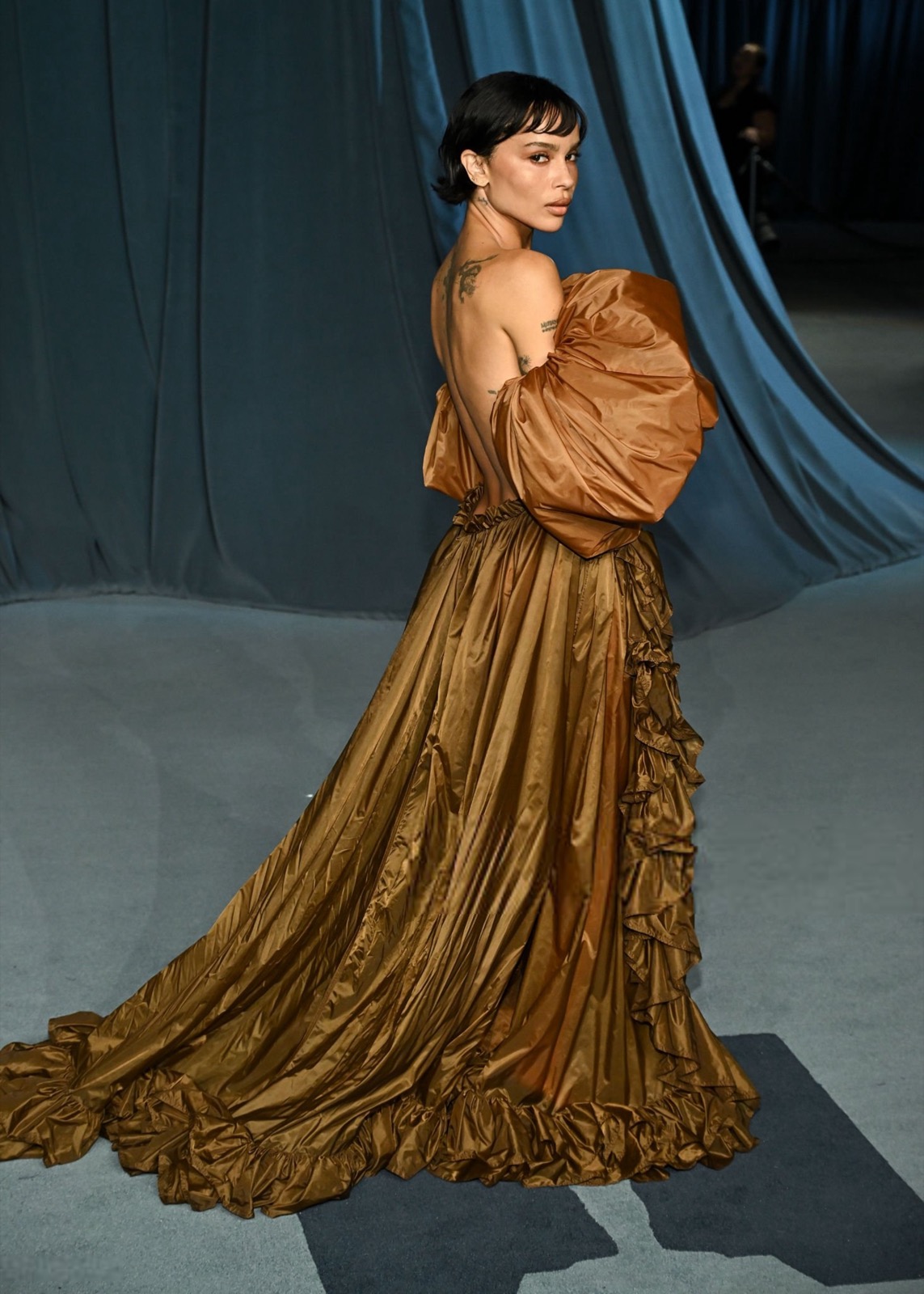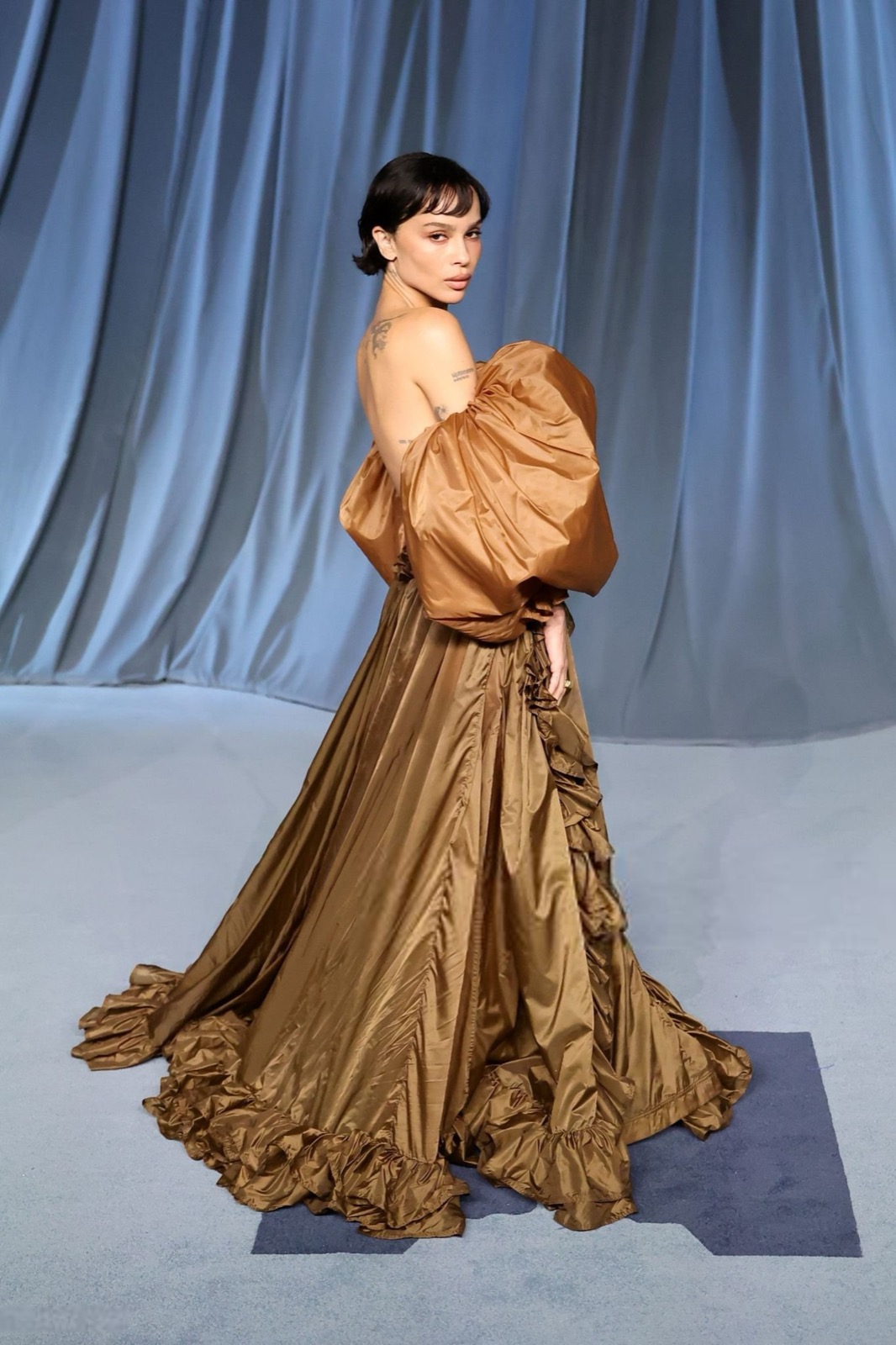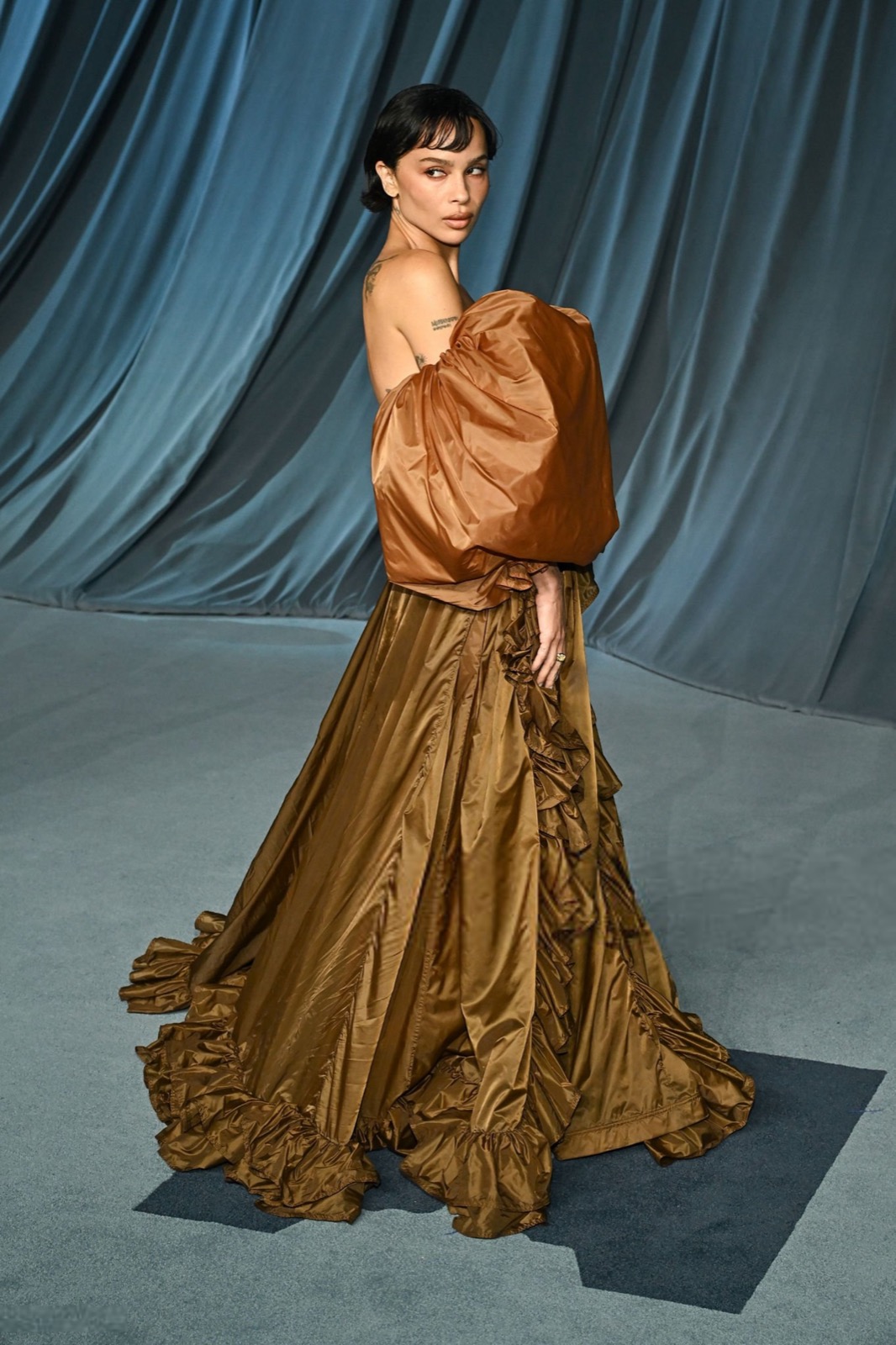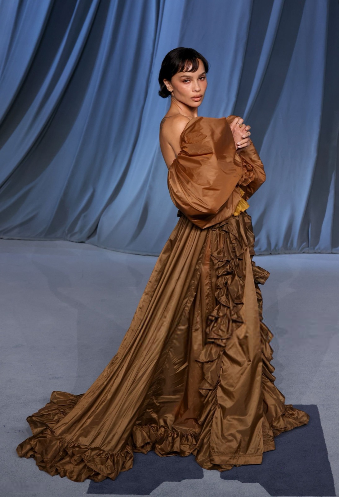 Au 5th Annual Academy Museum Gala, Zoë Kravitz flotte dans une robe couleur caramel, gonflée d’air et de désirs contenus. Ses épaules nues chuchotent à la soie des promesses interdites.