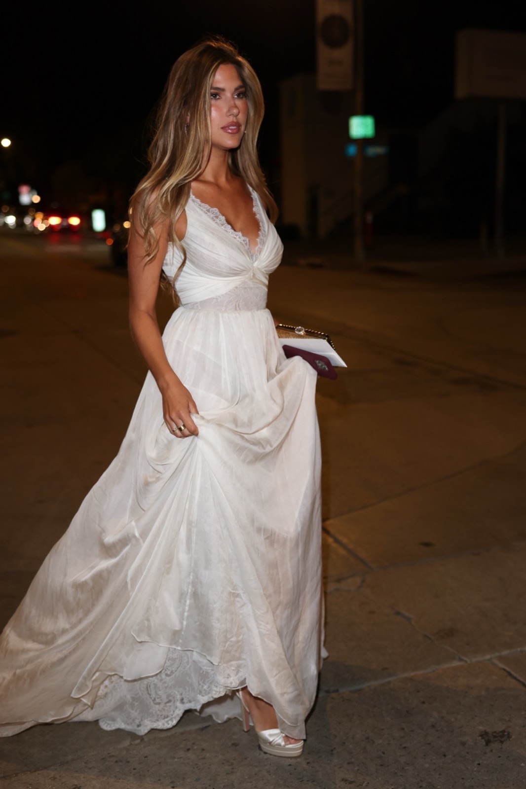 En sortant du Craig’s, Kara Del Toro semble flotter entre apparition angélique et fièvre nocturne. Sa robe immaculée épouse l’air du soir comme un aveu de pureté malicieuse.