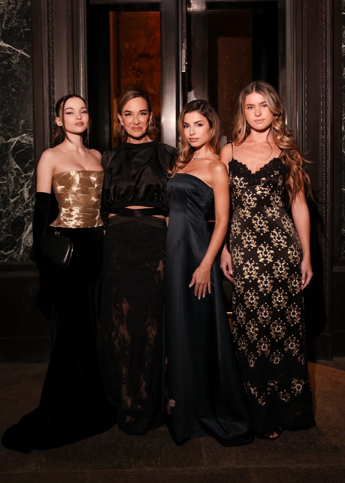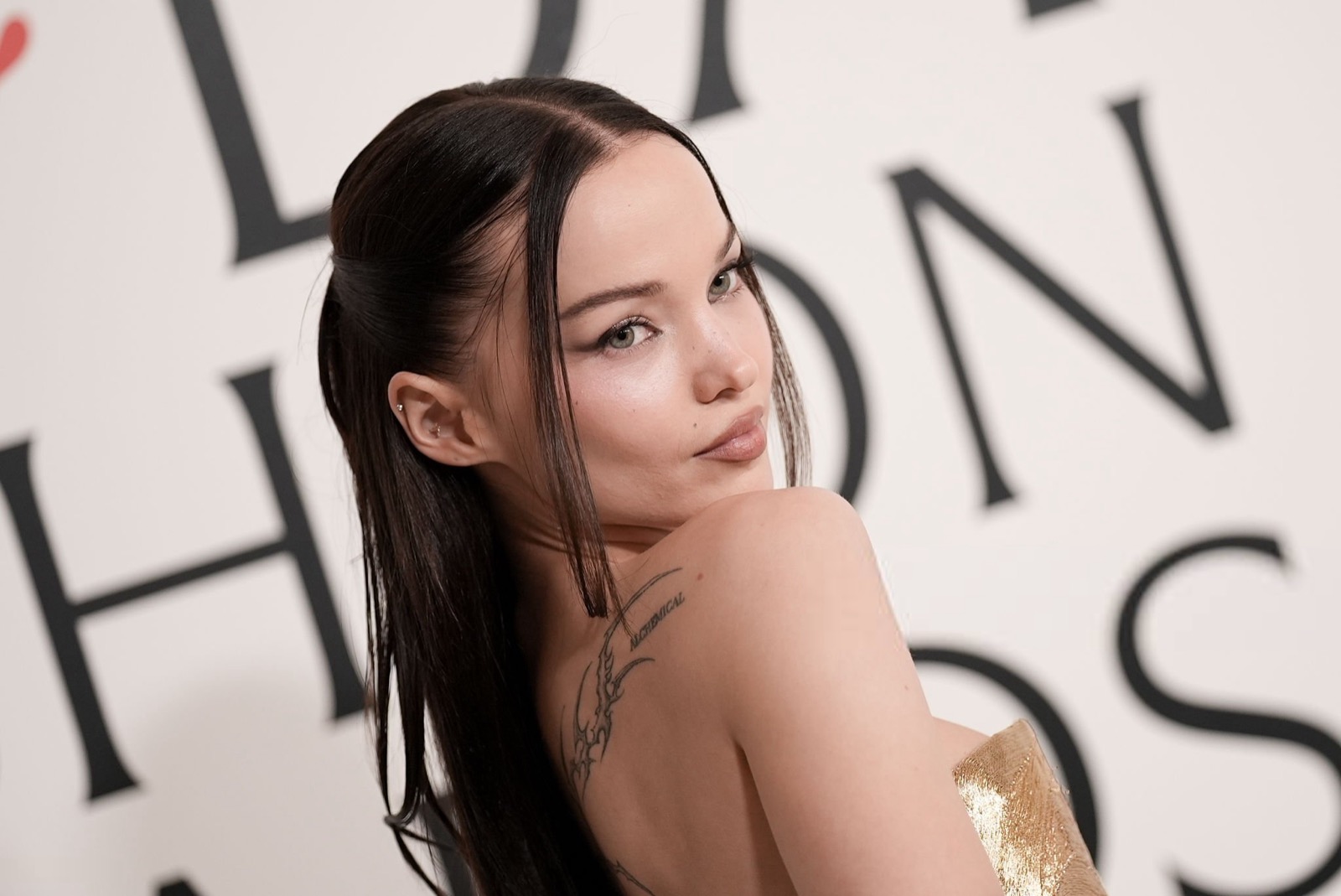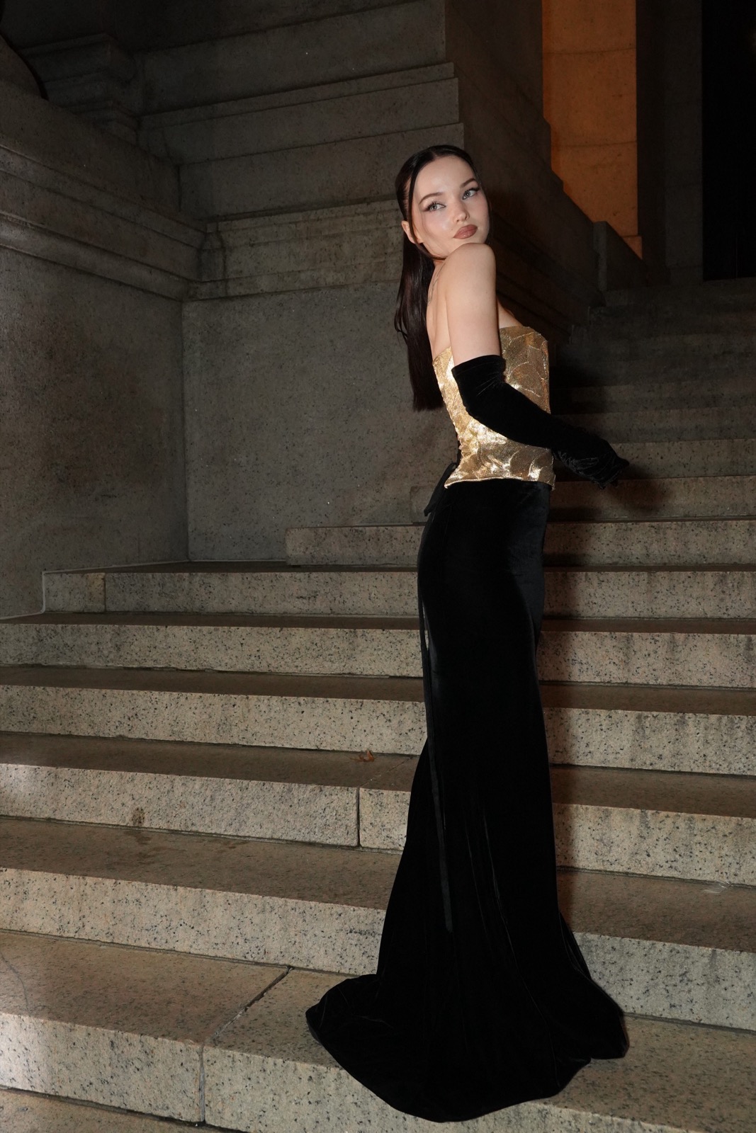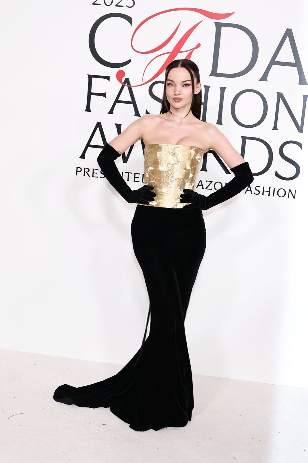 Dove Cameron glisse dans sa robe sirène, corset d’or et velours noir sculptant une anatomie de péché. Tout semble calculé : le port altier, la moue fatale, le gant long comme promesse.