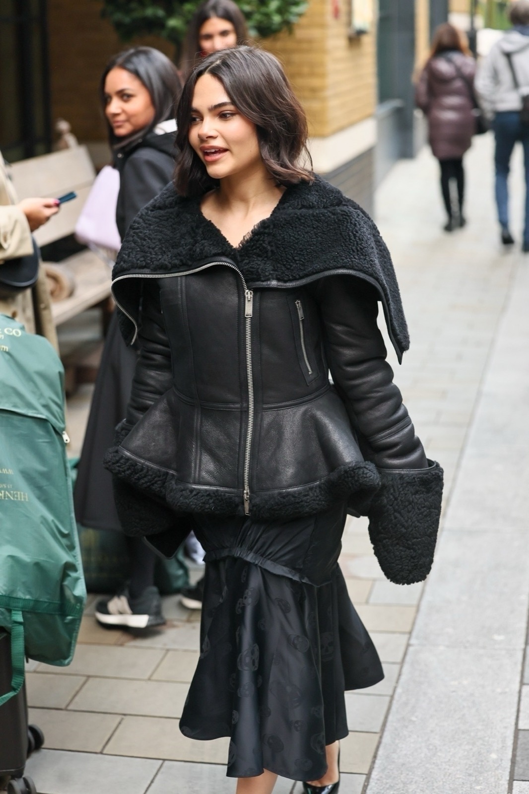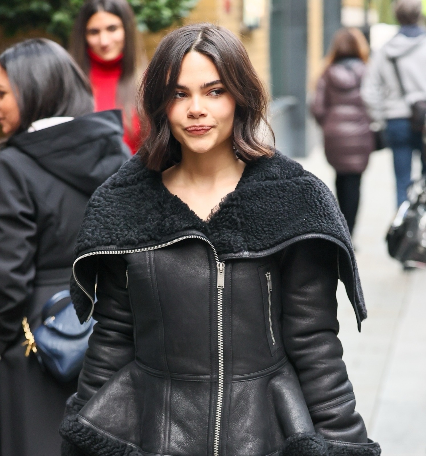 Ariana Greenblatt quitte son hôtel londonien avec la froide assurance d’une héroïne de film noir signée Netflix. Le cuir s’accroche à sa taille comme un secret brûlant, le col surdimensionné murmure des promesses interdites.