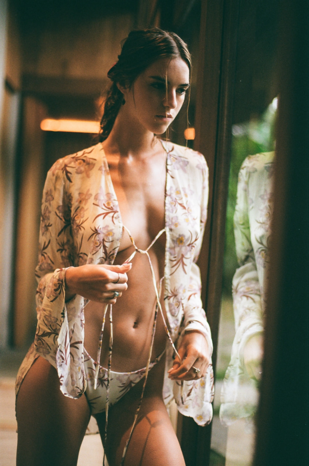 Sur la terrasse moite d’un rêve tropical, Emily Feld s’étire nue de presque tout, frôlant le vice avec un bikini couleur miel qui fond sur la peau. La serviette bleue devient autel, le bois craque sous la chaleur moite de LiveFast Magazine.