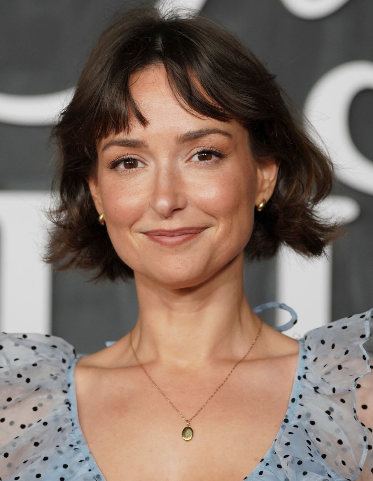 Dans sa robe bleutée à pois, elle avance avec ce calme redoutable qui fait vaciller les objectifs. Le look semble sage, mais sa précision millimétrée fait comprendre qu’elle sait parfaitement ce qu’elle fait.