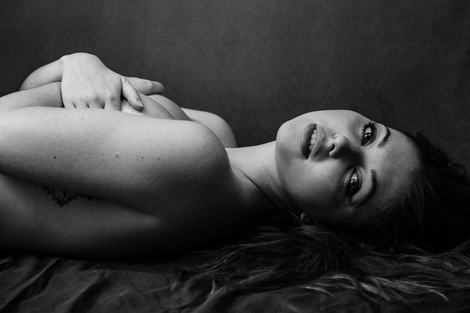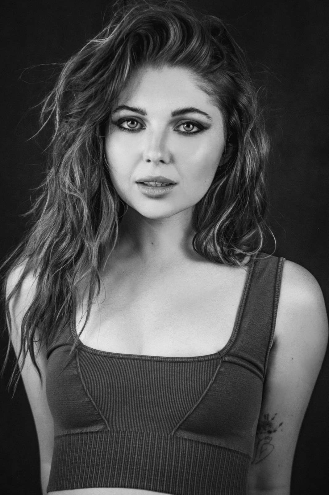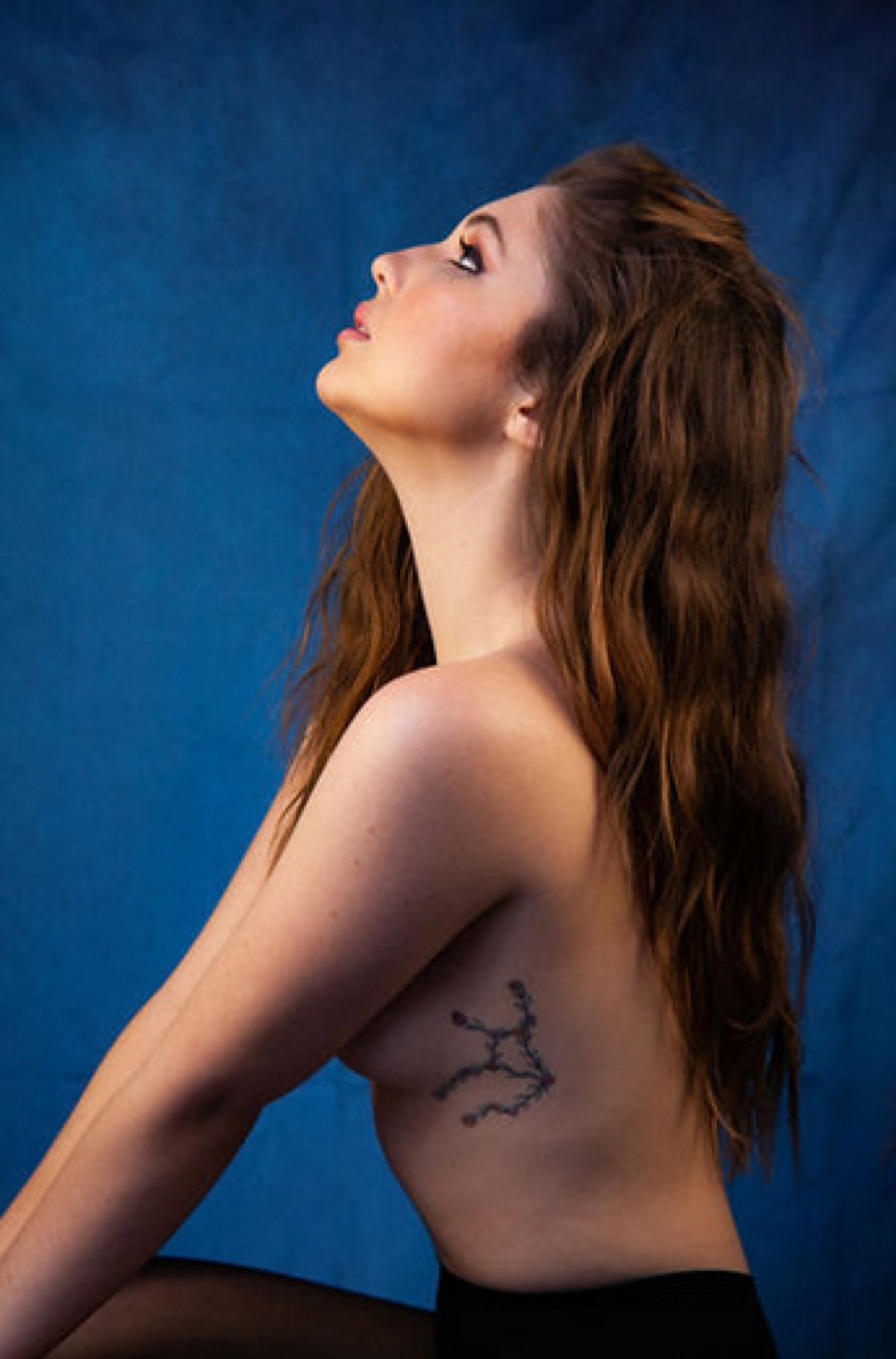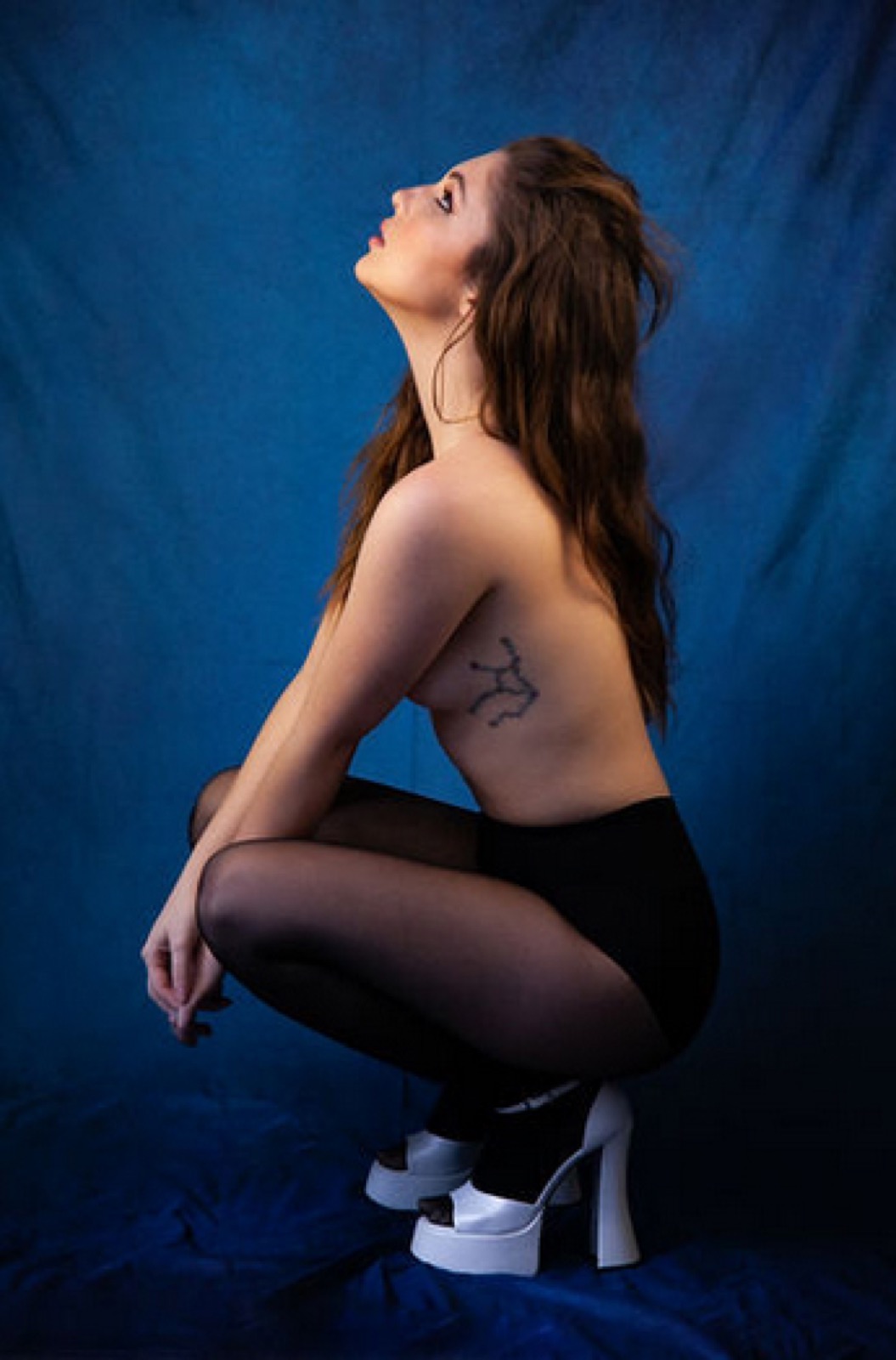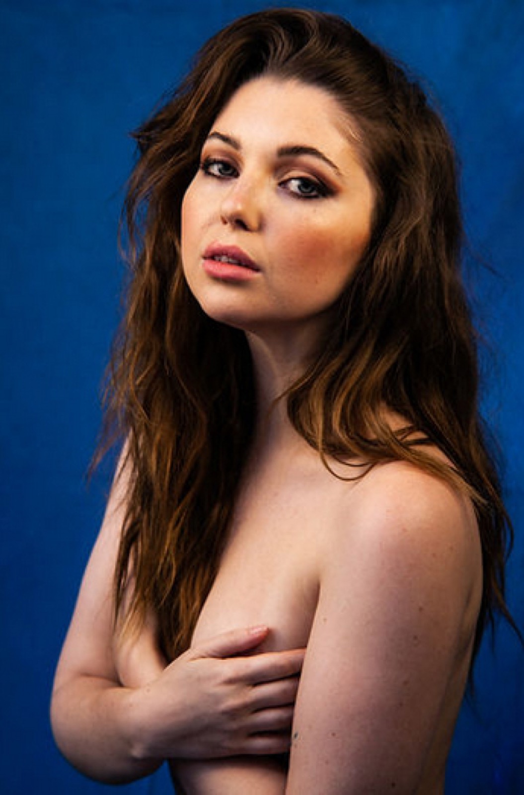 Sammi Hanratty topless en rébellion contrôlée dans un studio bleu