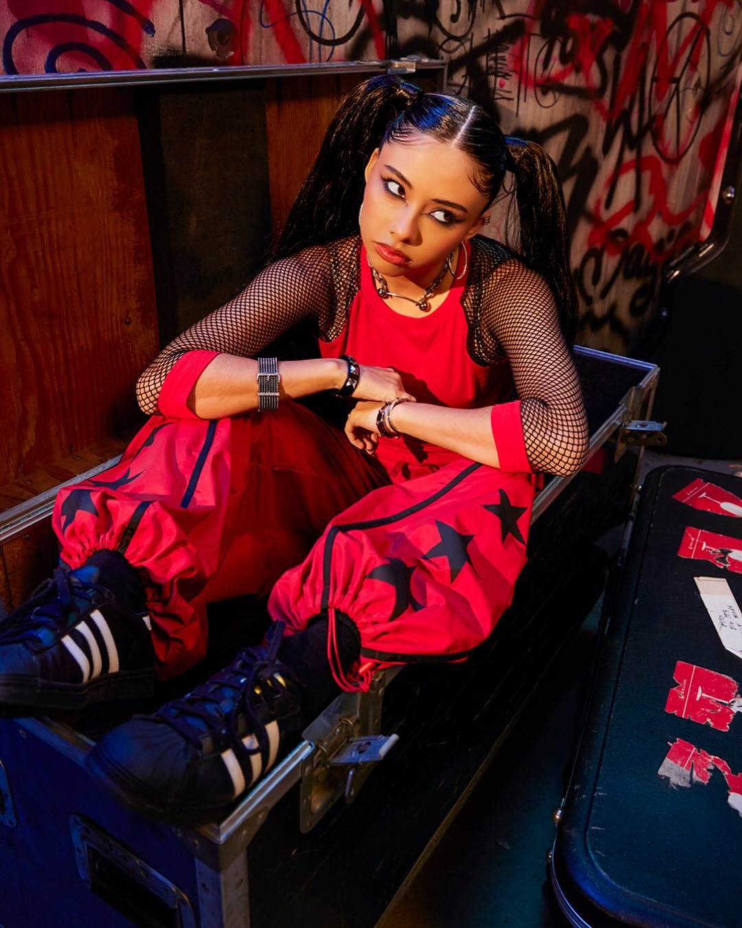 Entre graffitis et néons fatigués, Xochitl Gomez pose comme si elle menait une rébellion stylée, oscillant entre sarcasme discret et défi assumé.