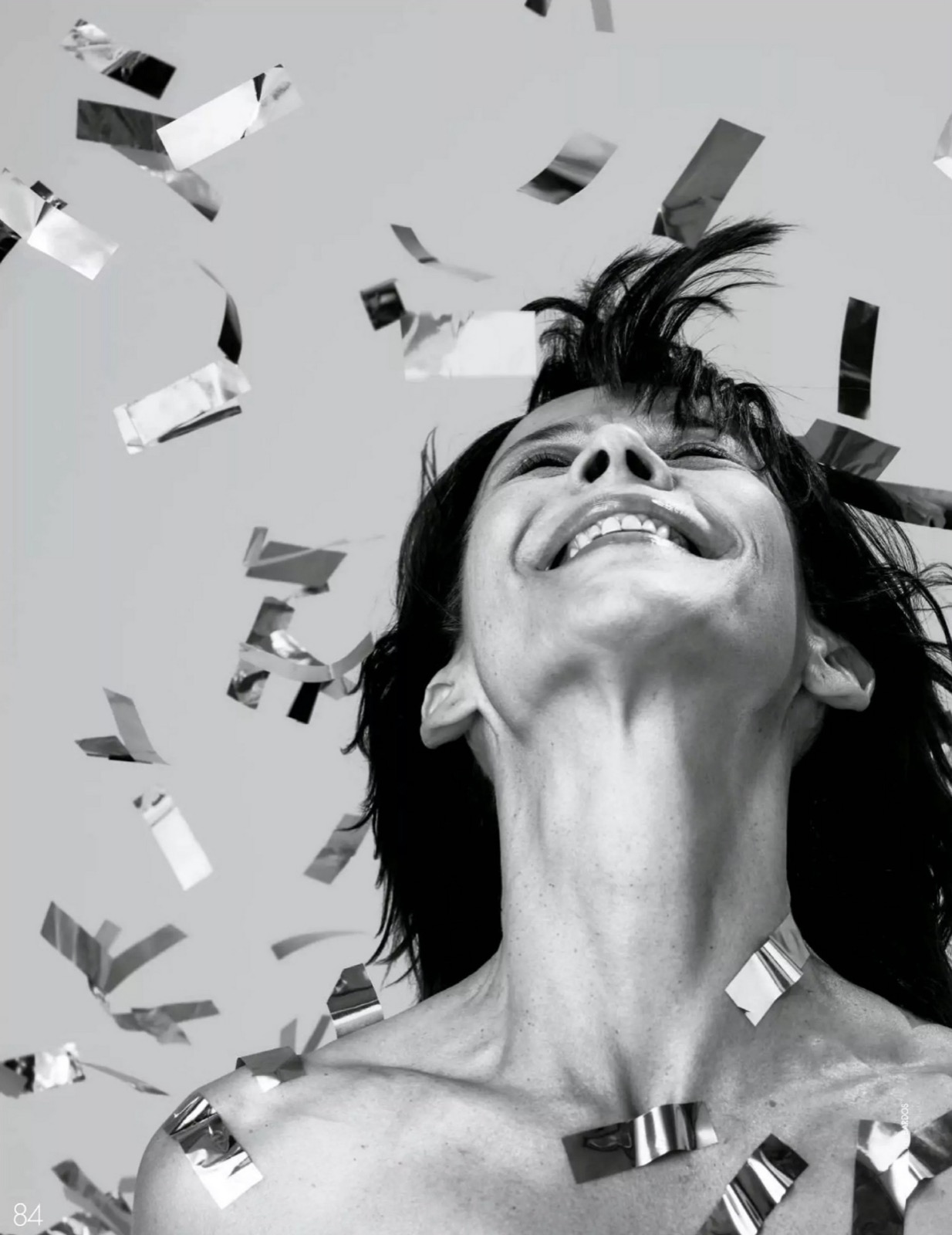 Sophie Marceau débarque dans ce shooting comme si elle avait gagné un duel contre une piñata géante. Elle lève le bras, fière, pendant que les confettis cherchent encore leur dignité au sol.