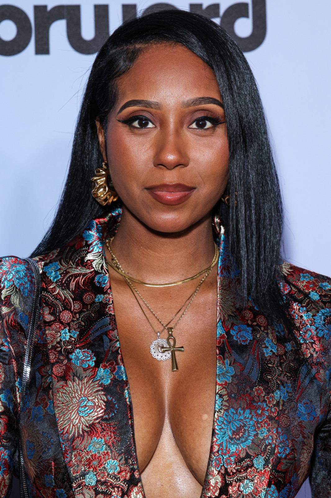 Au gala Give Her FlowHERS de Femme It Forward à Los Angeles, Khat Rabbani pose dans un tailleur brocart qui semble avoir volé la vedette au décor. Le décolleté assumé dessine une ligne dramatique parfaitement maîtrisée, presque chorégraphiée.