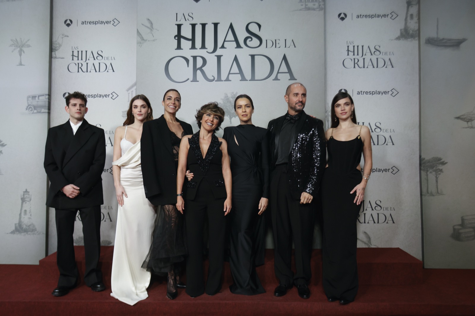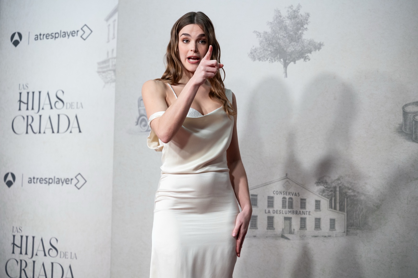 Au Callao Cinema, elle apparaît en robe ivoire, tissu qui file comme du satin et tranche avec le décor rétro de la première de Las Hijas De La Criada.