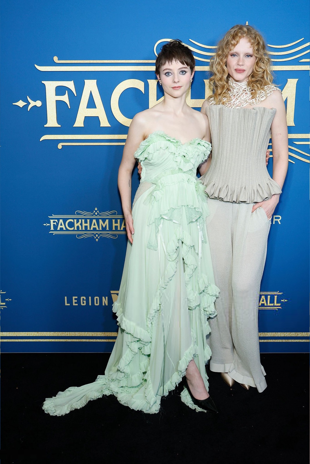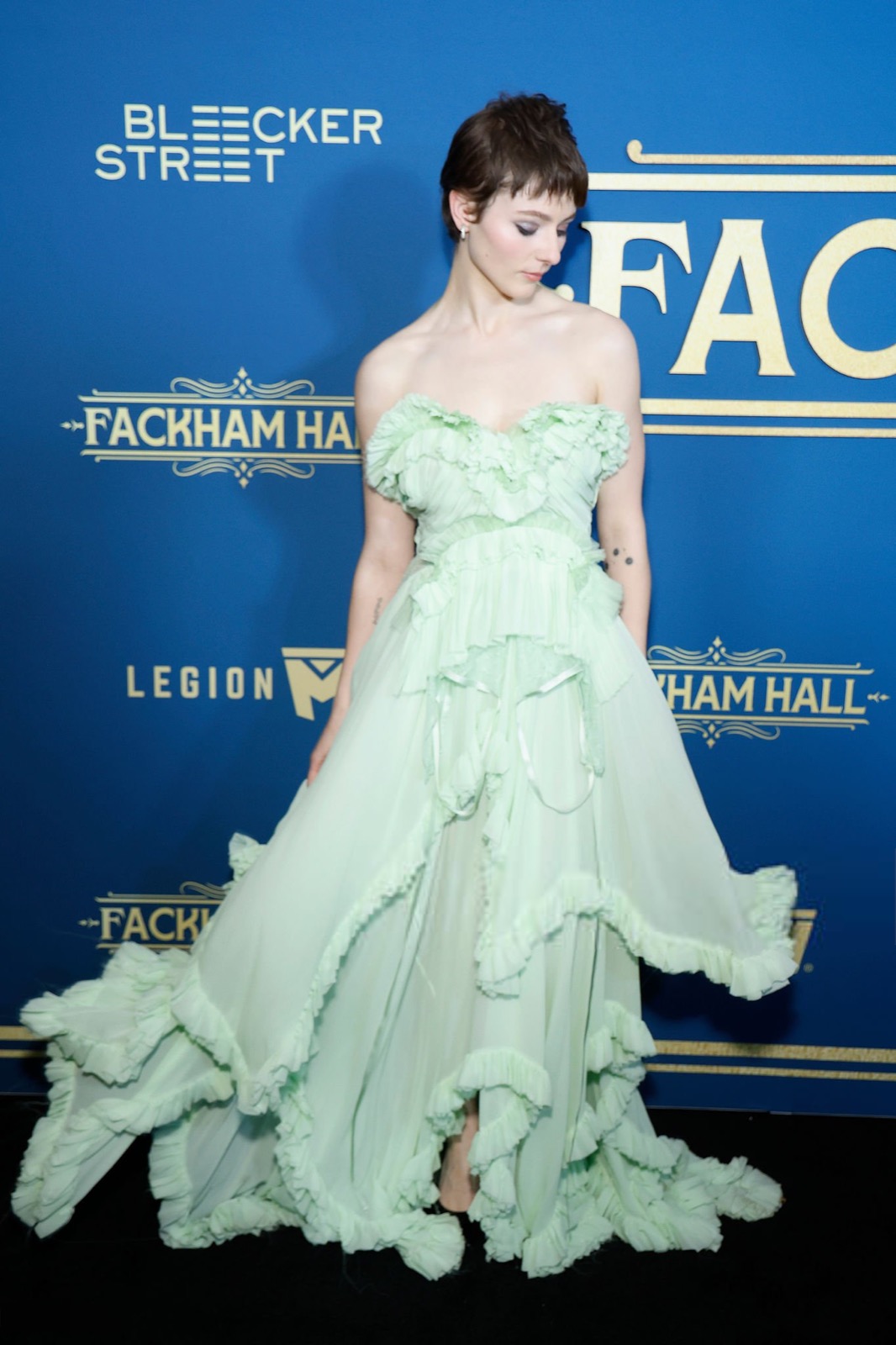 Sur le tapis rouge de Fackham Hall, Thomasin McKenzie avance avec une robe vert pâle qui ressemble à une pâtisserie de luxe décidée à devenir star. Les volants se battent pour attirer la lumière, et c’est elle qui gagne, évidemment.