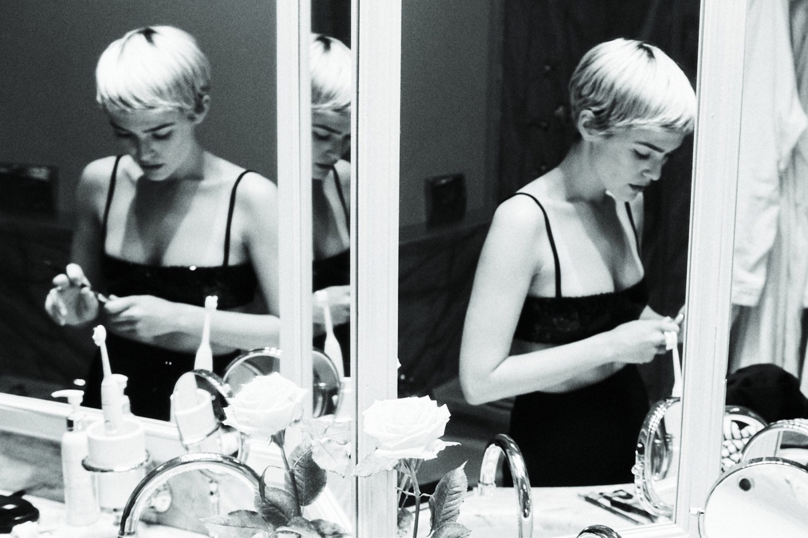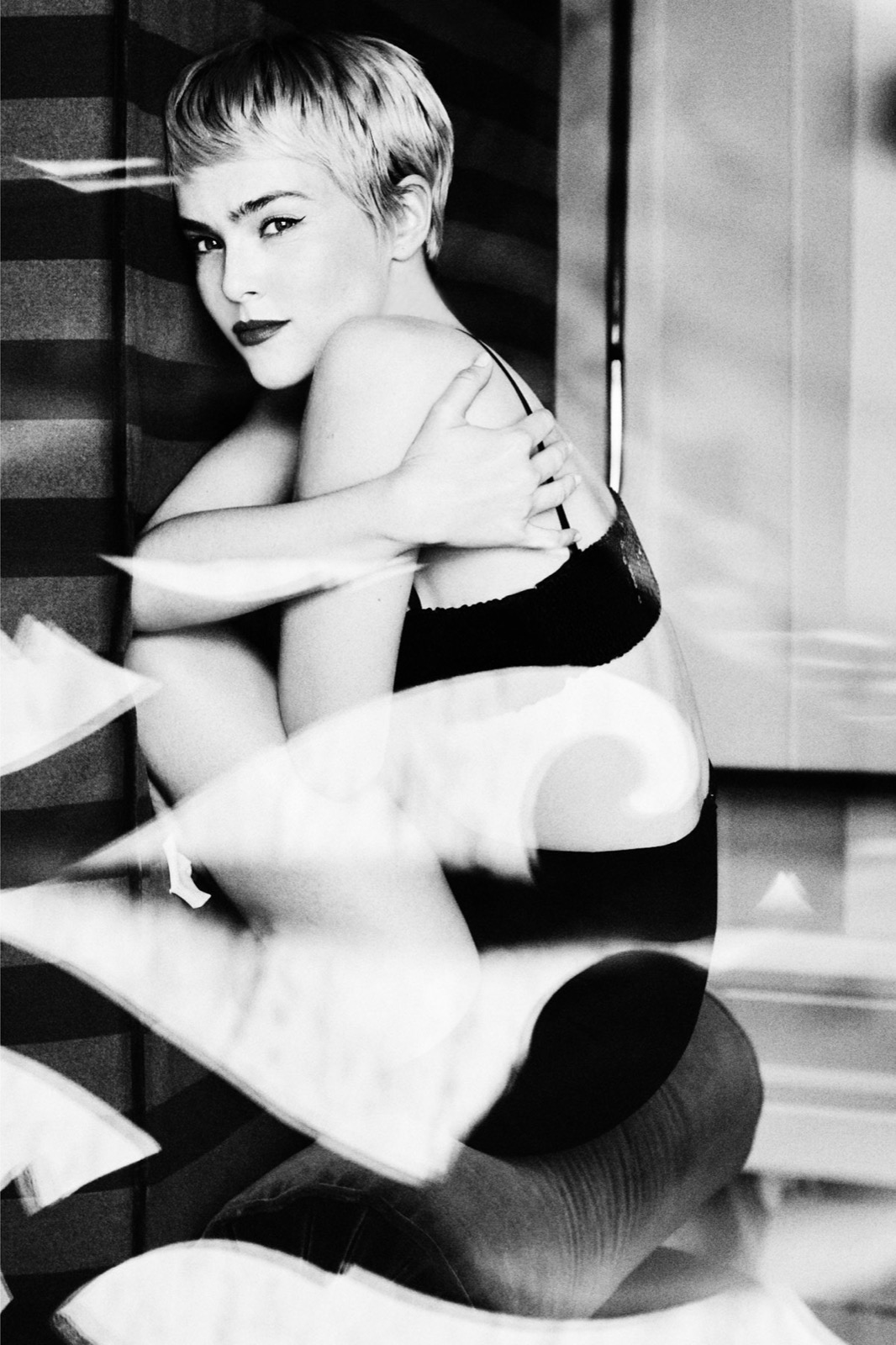 Le noir et blanc serre le cadre, le miroir double le jeu, le corps se replie sans jamais se cacher. Pas de pose aimable, juste une tension élégante, parfaitement assumée.