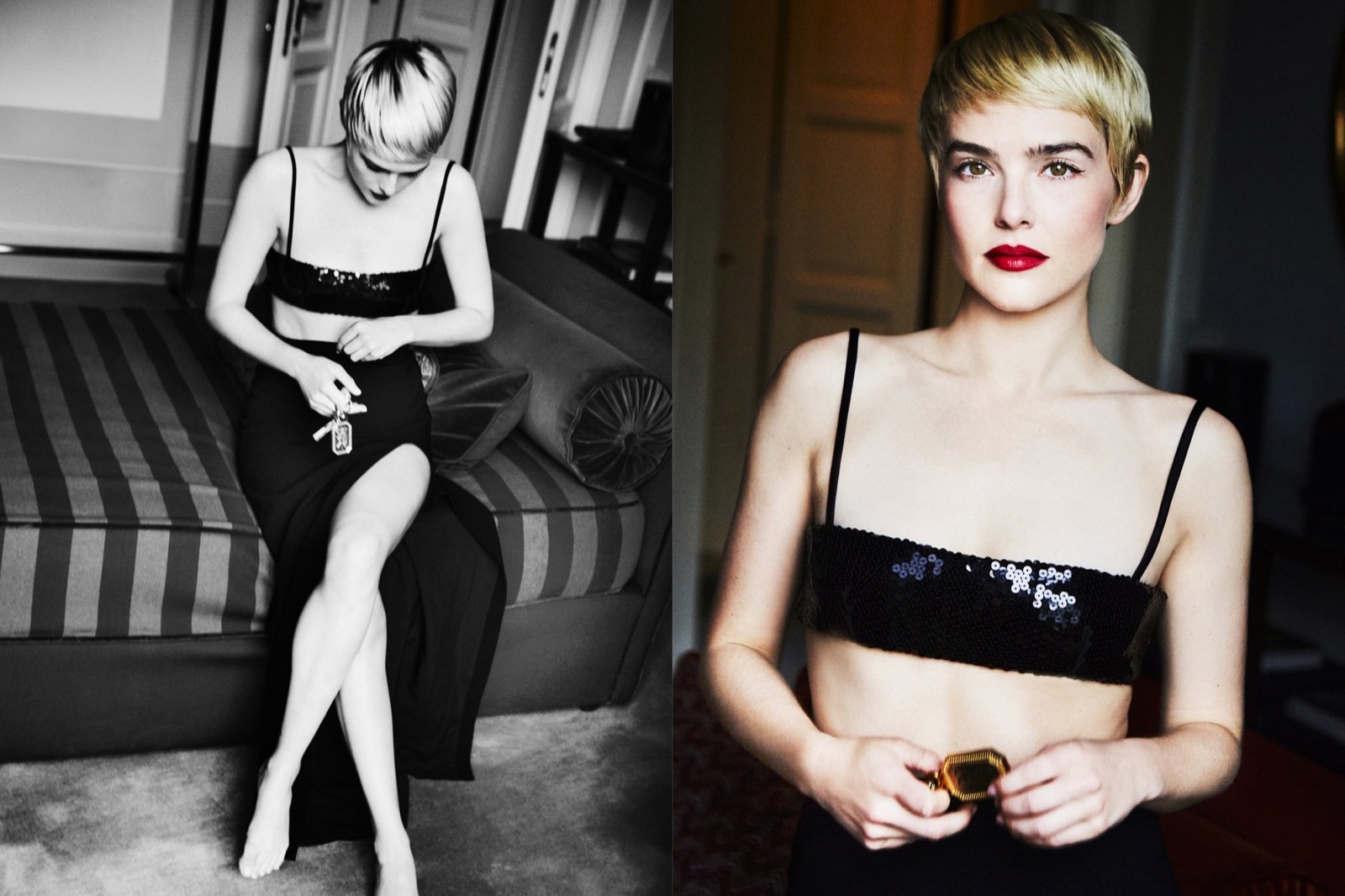 Coupe courte, bouche rouge, regard frontal : Zoey retire tout le superflu et laisse le silence faire le sale boulot.