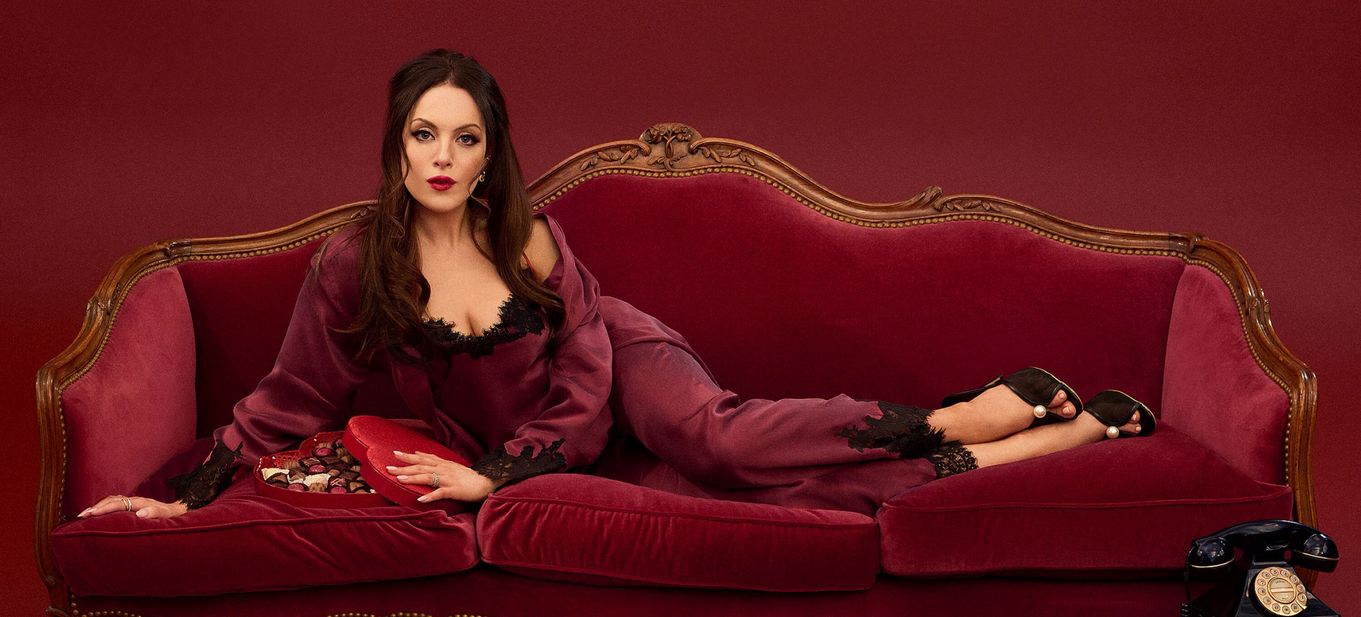 Elizabeth Gillies s’installe dans la Adore Me Atelier Collection comme chez elle : peignoir bordeaux, dentelle noire, air faussement distrait. Le décor rouge profond évoque un hôtel trop chic pour demander le Wi-Fi, et elle joue la cliente qui a déjà tout payé.