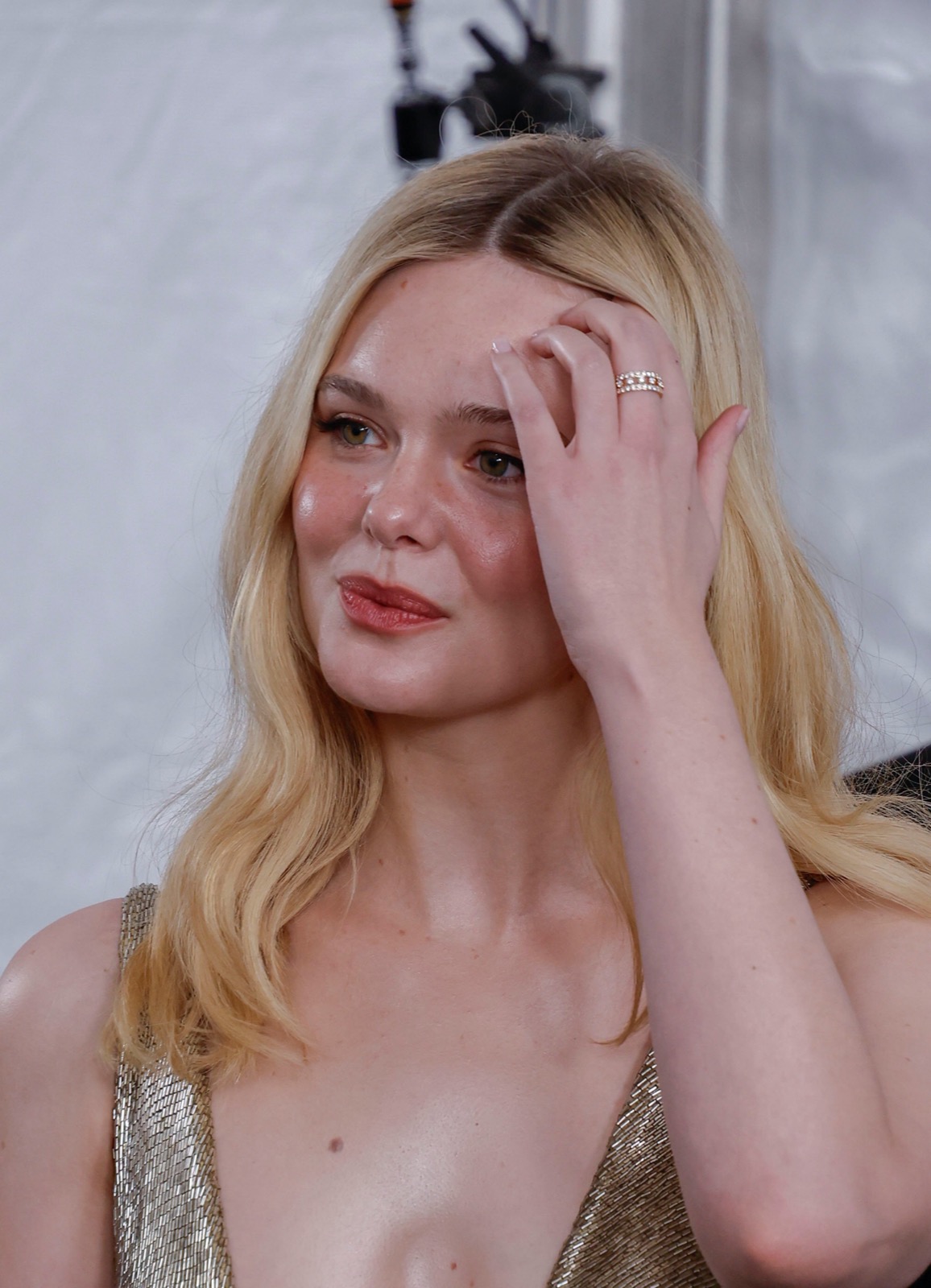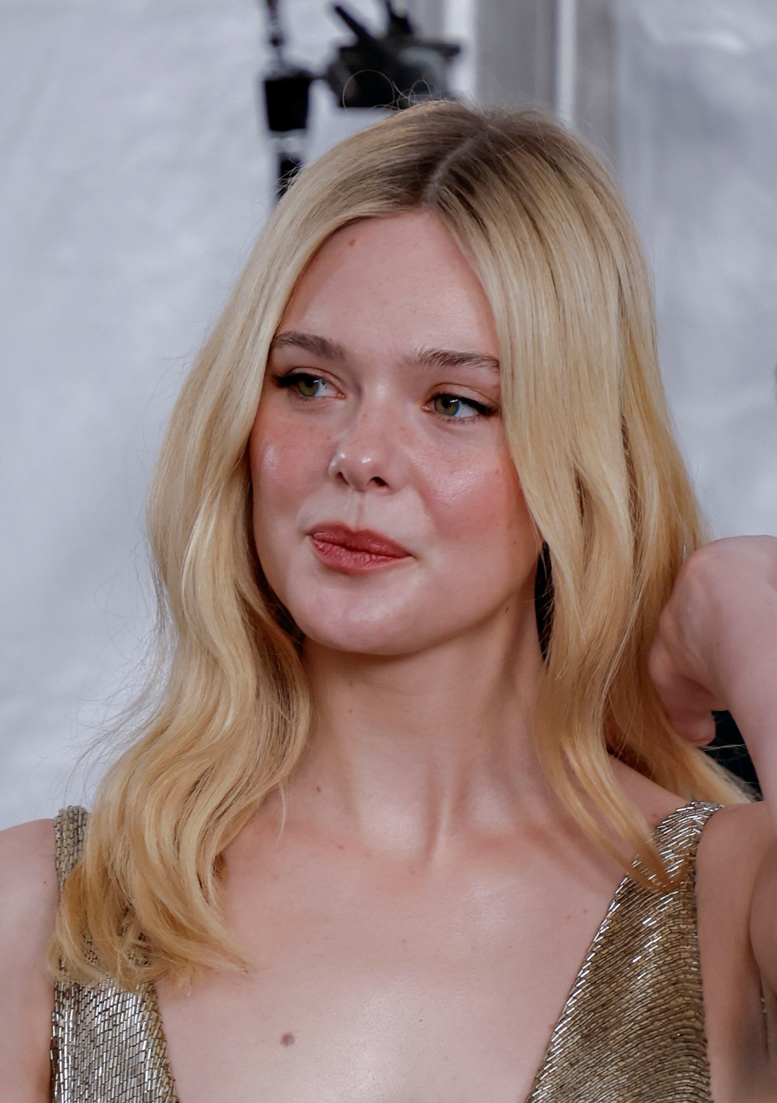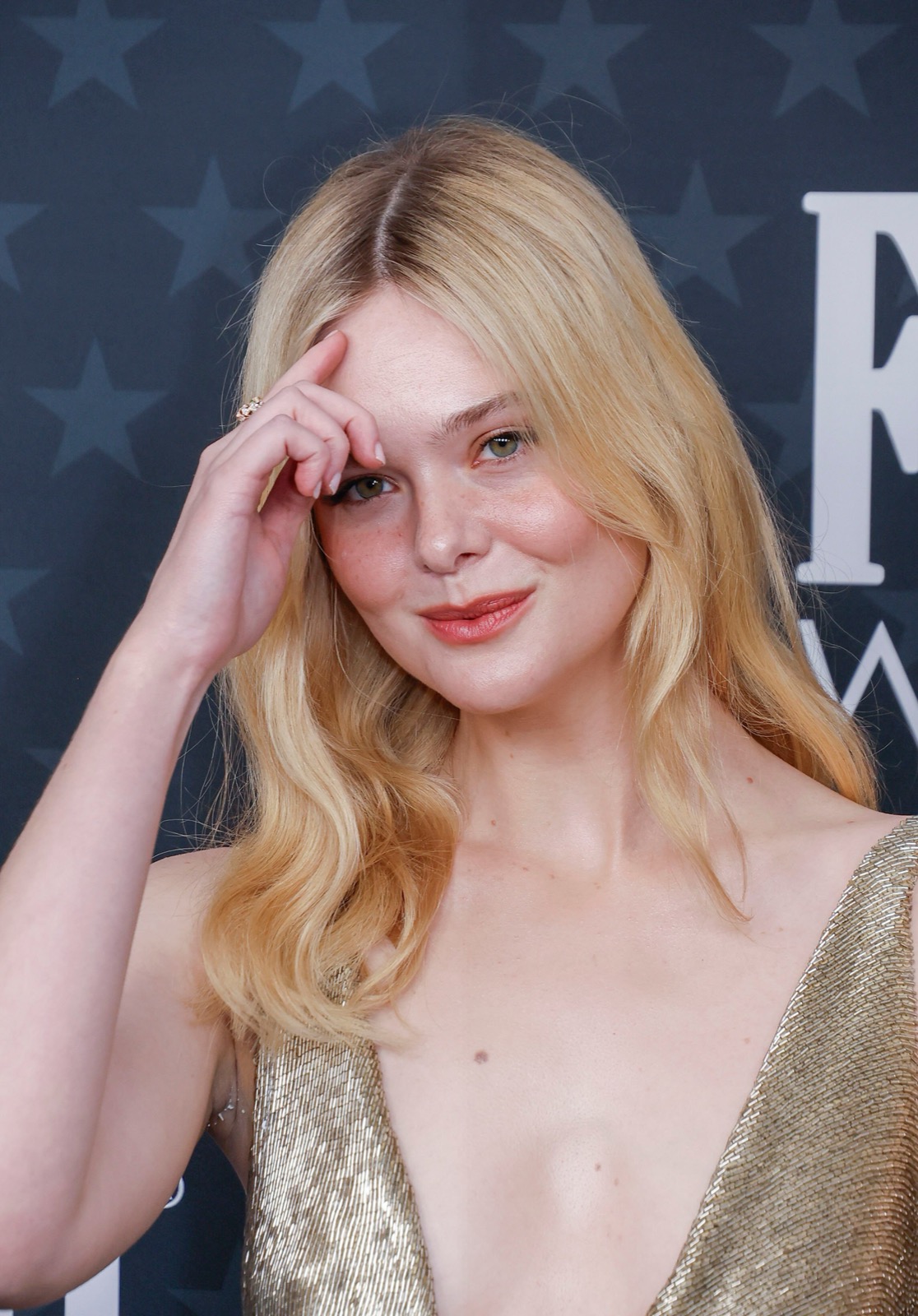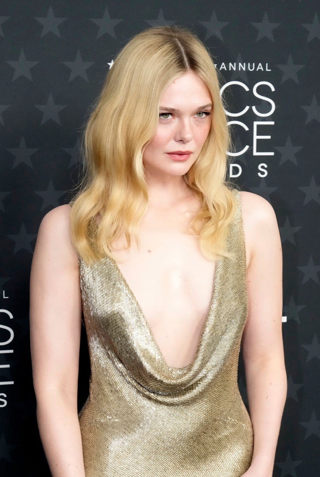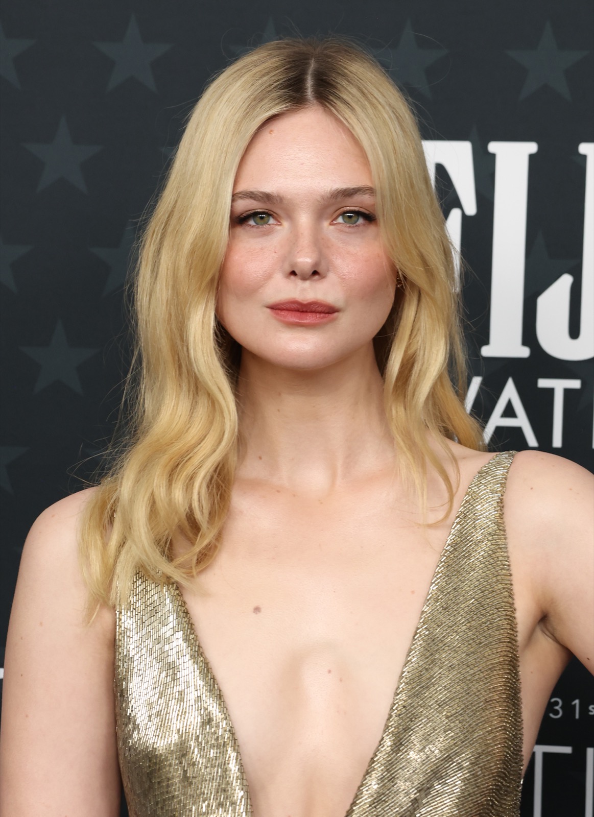 Sous les étoiles sages des Critics Choice Awards, Elle Fanning avance en robe or liquide, calibrée pour glisser dangereusement entre angélisme et stratégie visuelle. Le tissu brille, le décolleté s’affaisse, et le sourire fait semblant de ne rien comprendre à l’agitation alentour.