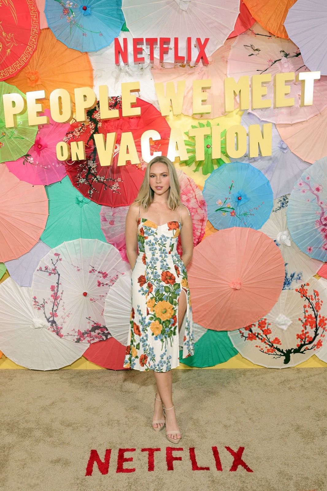 À la première du film People We Meet On Vacation, Jordyn Jones avance devant un décor si jaune qu’il menace la rétine. Robe fleurie calibrée, fente prudente, posture très validée par Netflix, elle sourit à peine, comme si l’enthousiasme était optionnel et facturé en supplément.