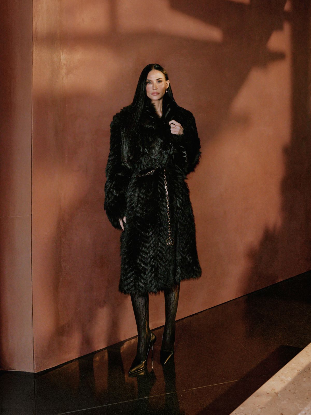 Demi Moore pose pour WWD planquée dans une fourrure gigantesque, comme si le chauffage avait été coupé par erreur. Puis soudain, une jambe surgit, gainée et très sûre d’elle, sabotant ce glamour trop sage.