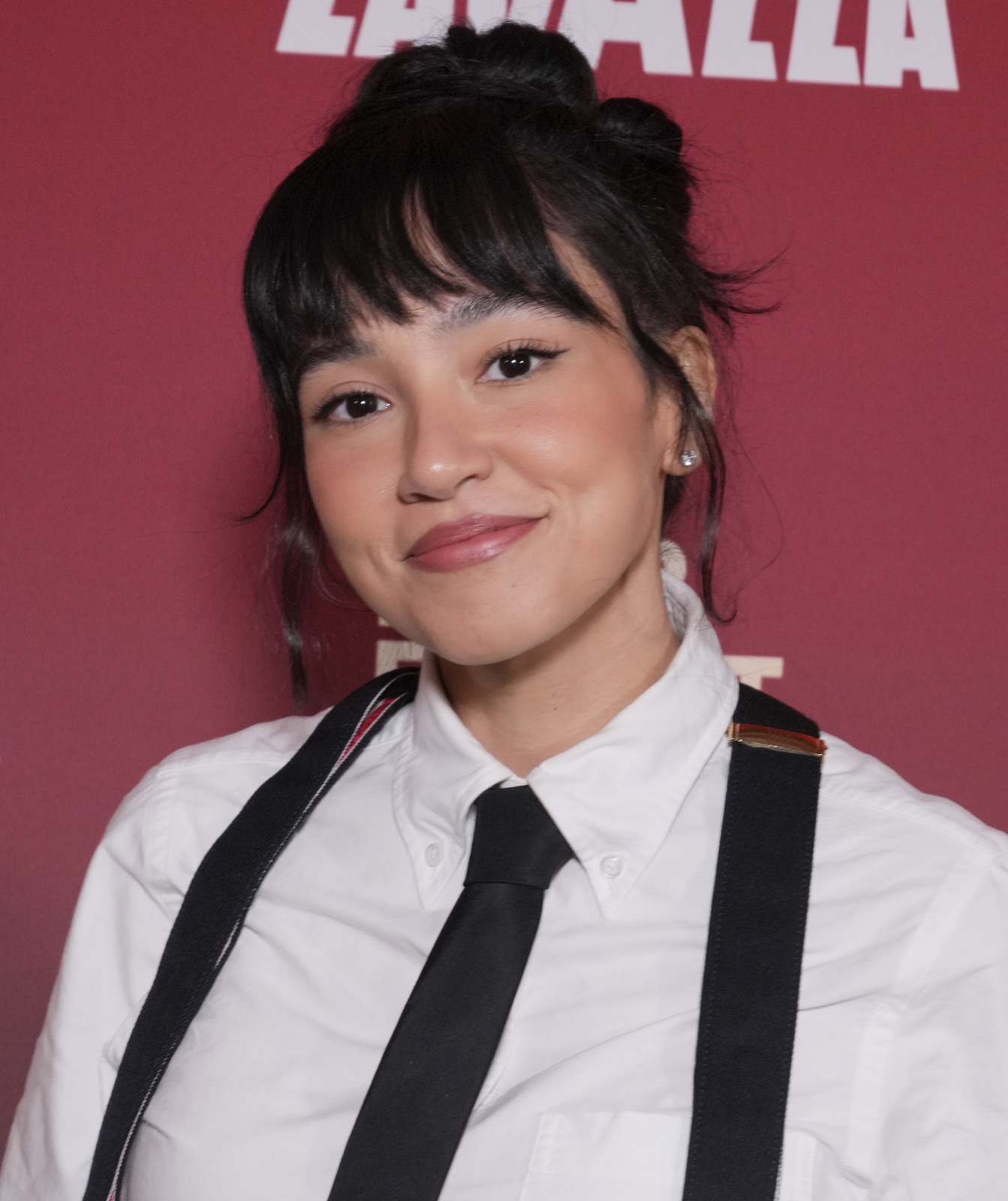 Wally Baram pose en serveur chic, chemise blanche, bretelles tendues, cravate trop sérieuse. Sourire sage, hanche penchée, elle joue l’élève modèle qui sait exactement désobéir. Devant les flashs, la tenue promet discipline, l’attitude murmure insolence, brunch ou pas.