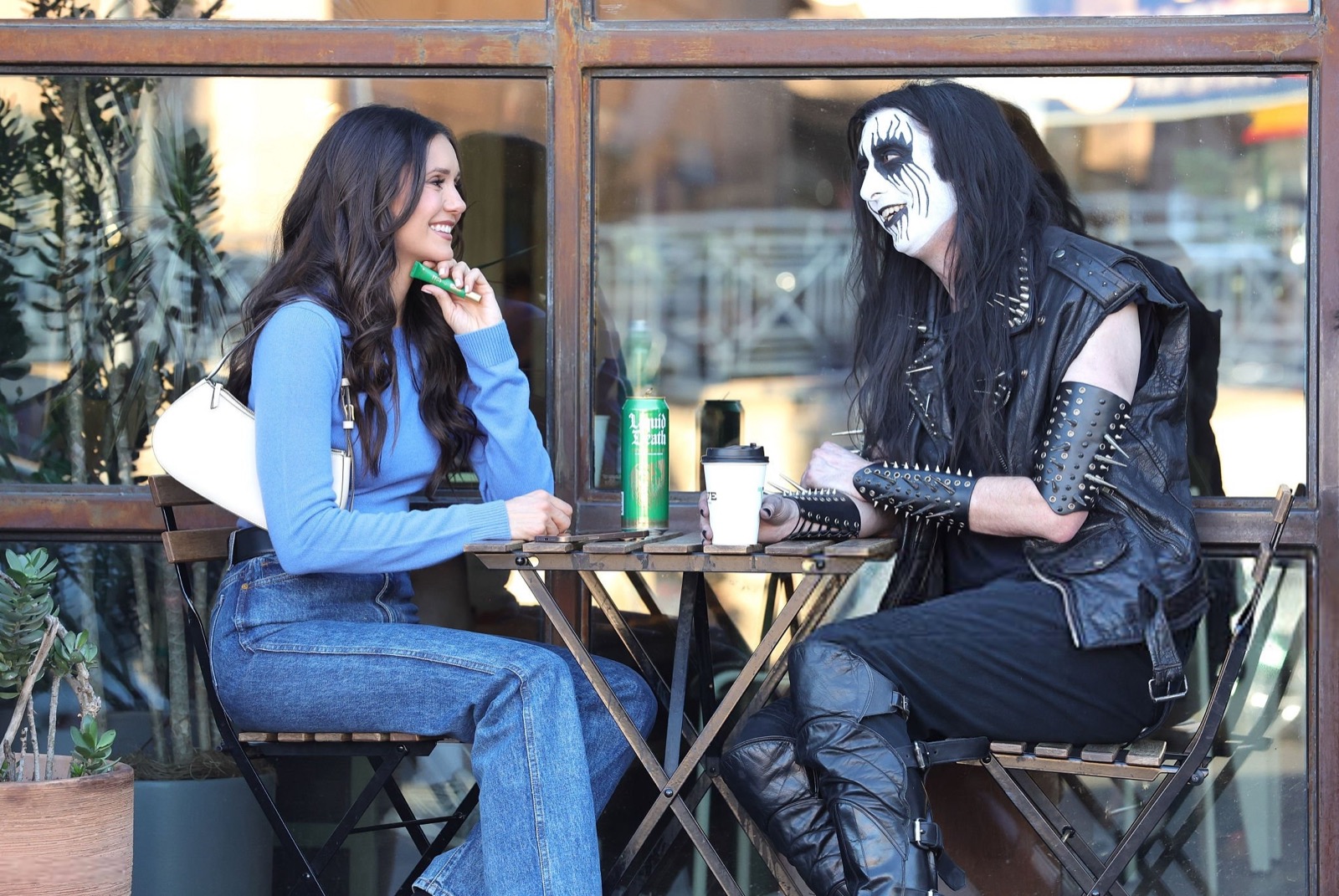 Nina Dobrev tourne une pub maquillage avec un goth en terrasse
