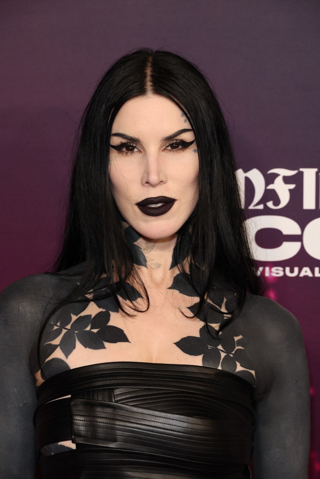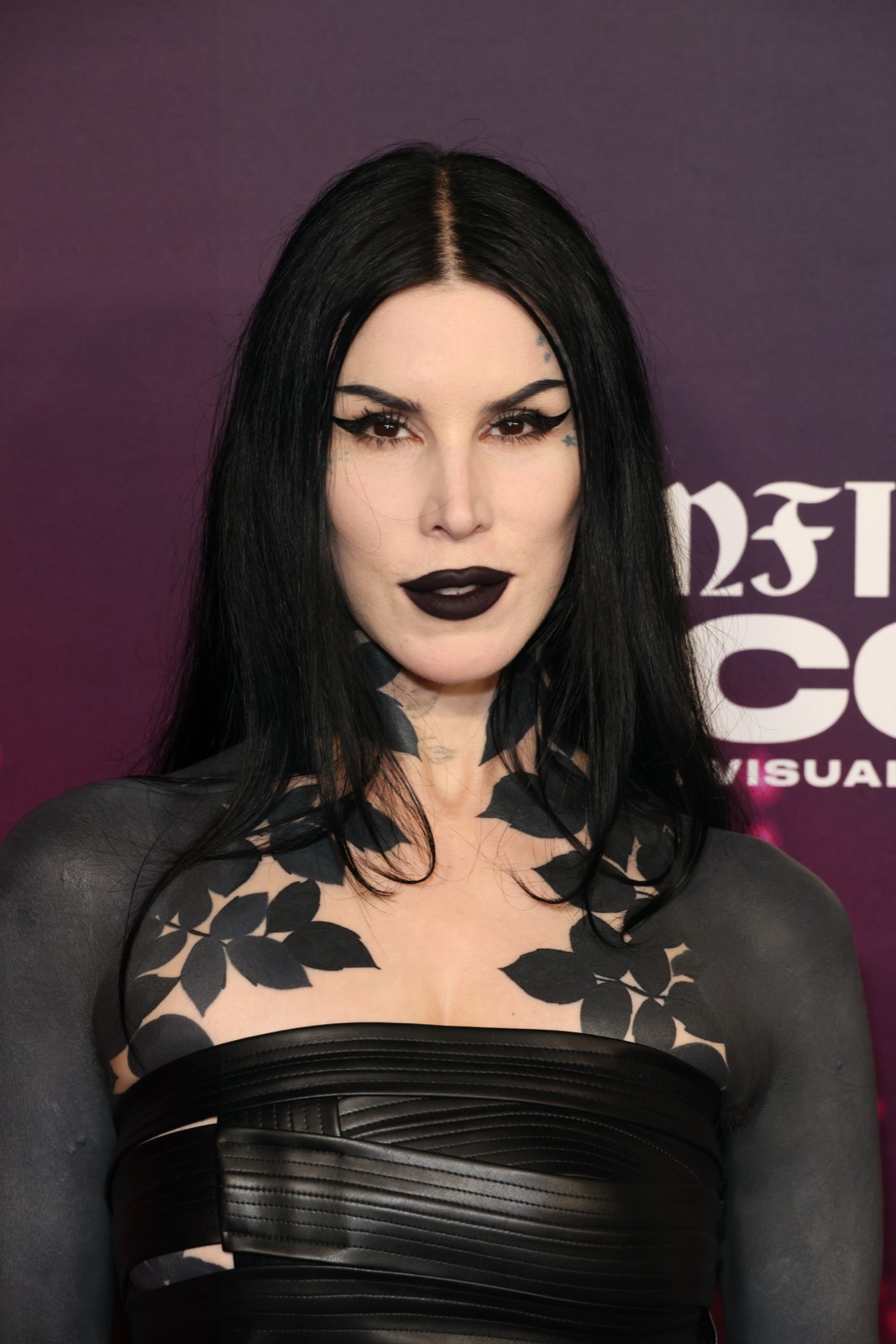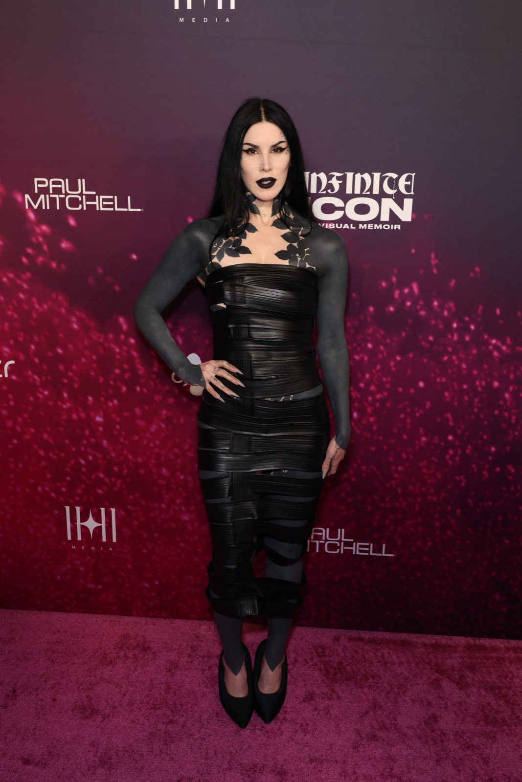 Robe noire serrée comme un bandage, épaules peintes, regard qui pique, Kat Von D avance figée, comme si la tenue tenait le corps droit pendant que le sourire menace de craquer.