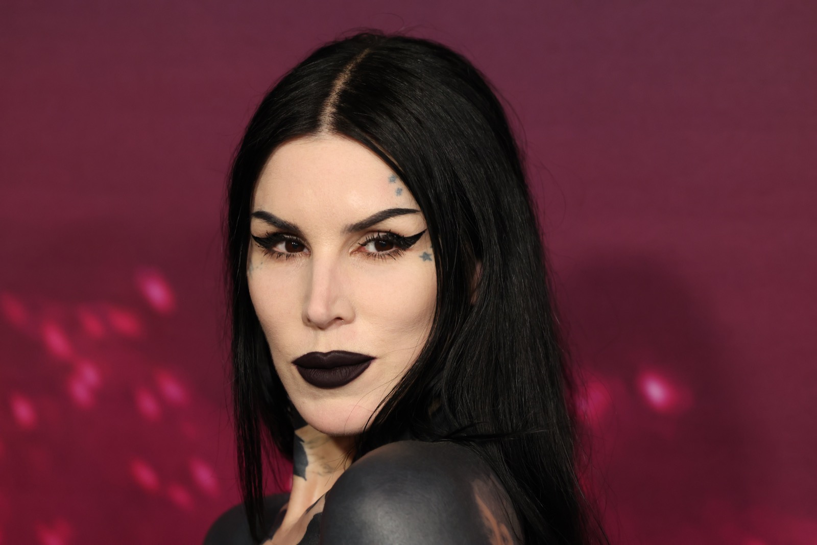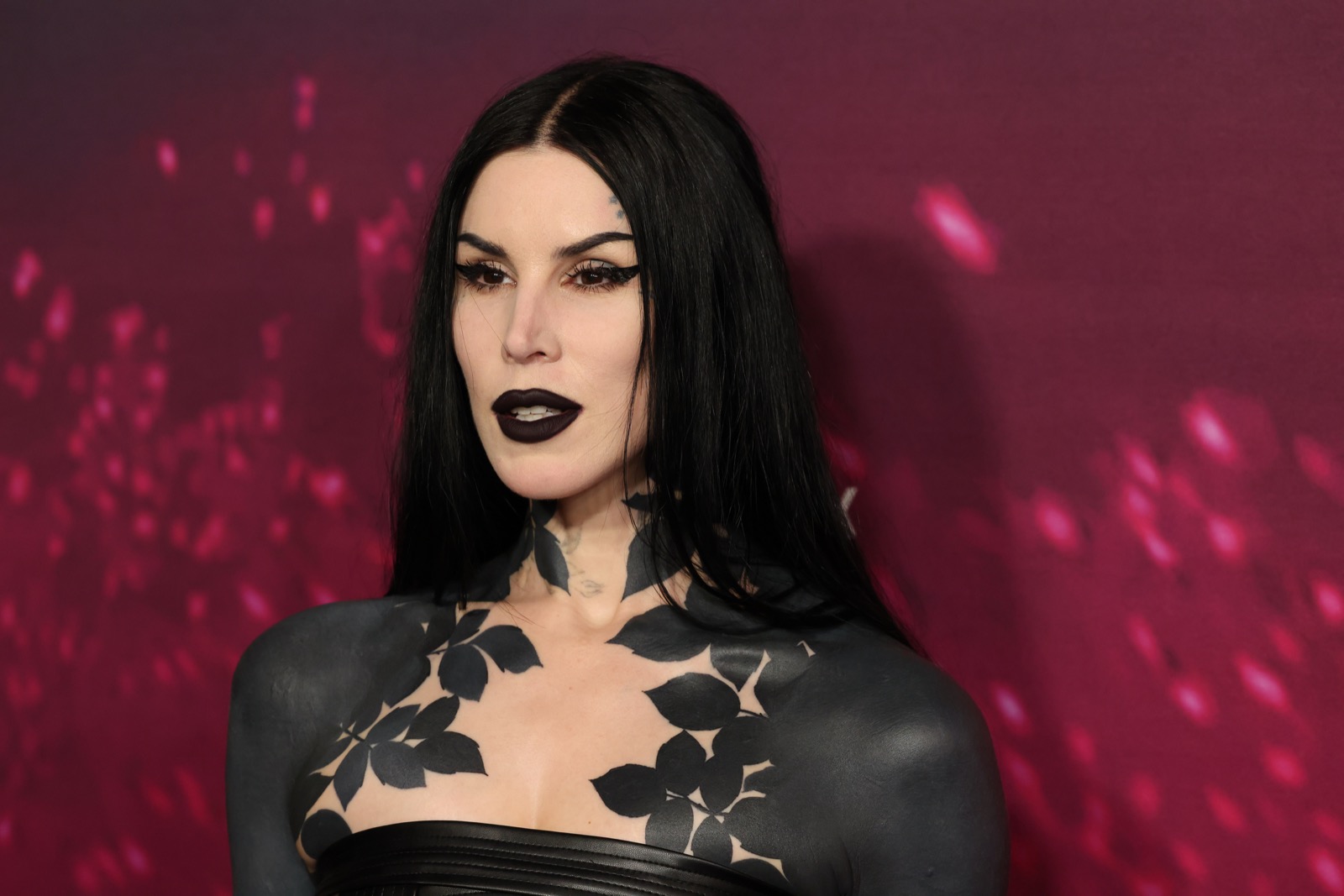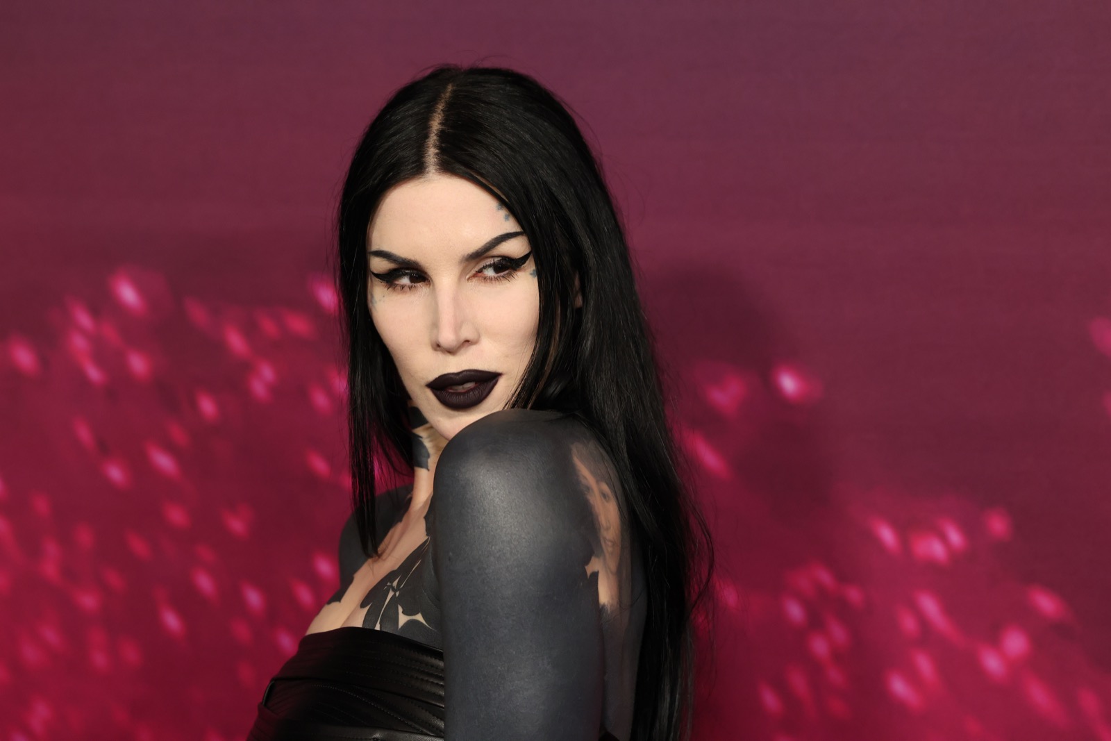 Robe noire serrée comme un bandage, épaules peintes, regard qui pique, Kat Von D avance figée, comme si la tenue tenait le corps droit pendant que le sourire menace de craquer.